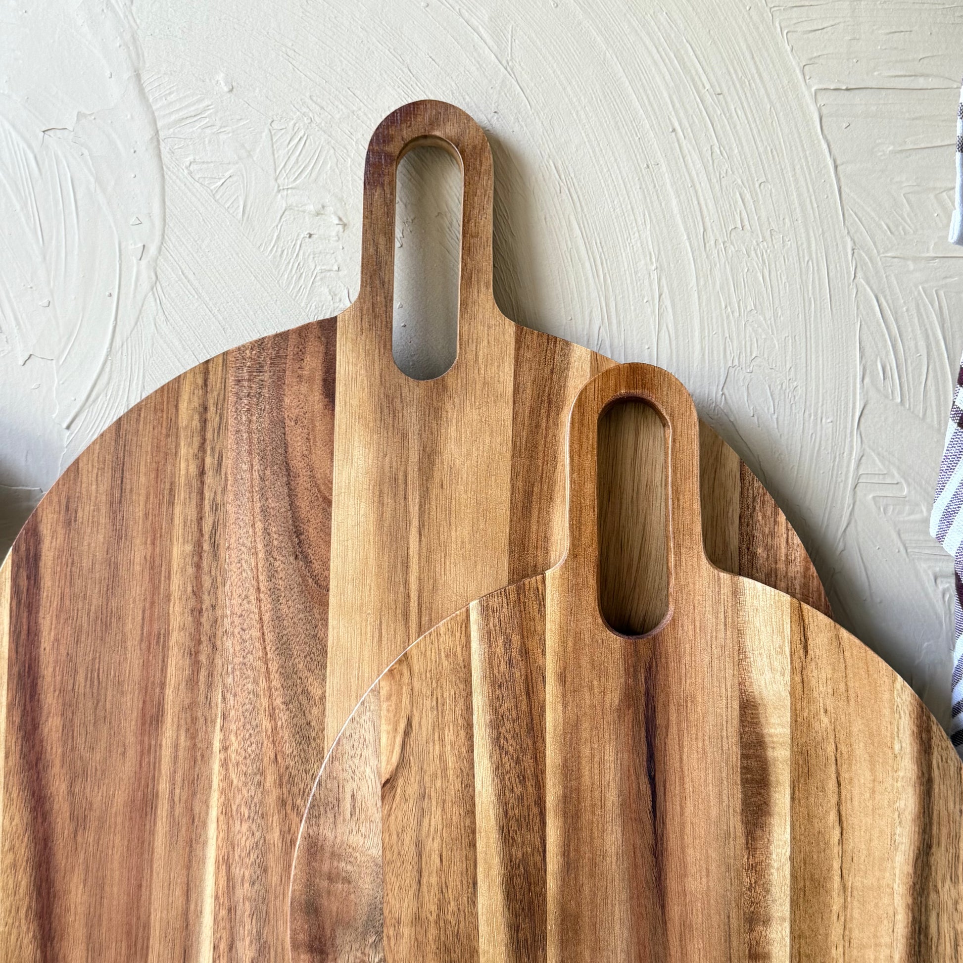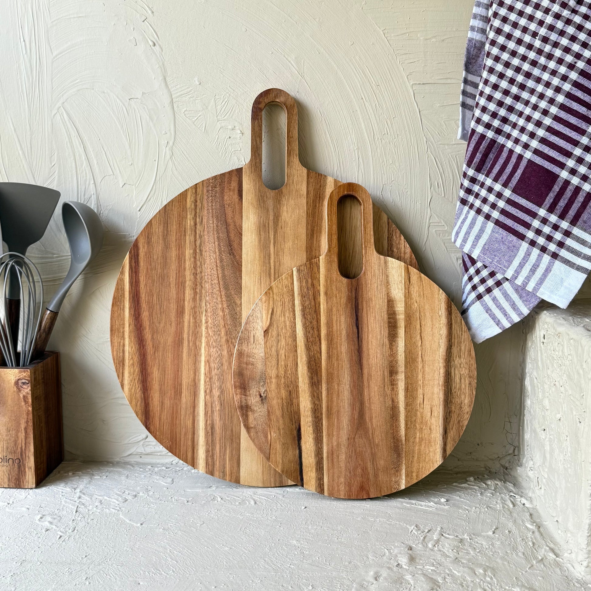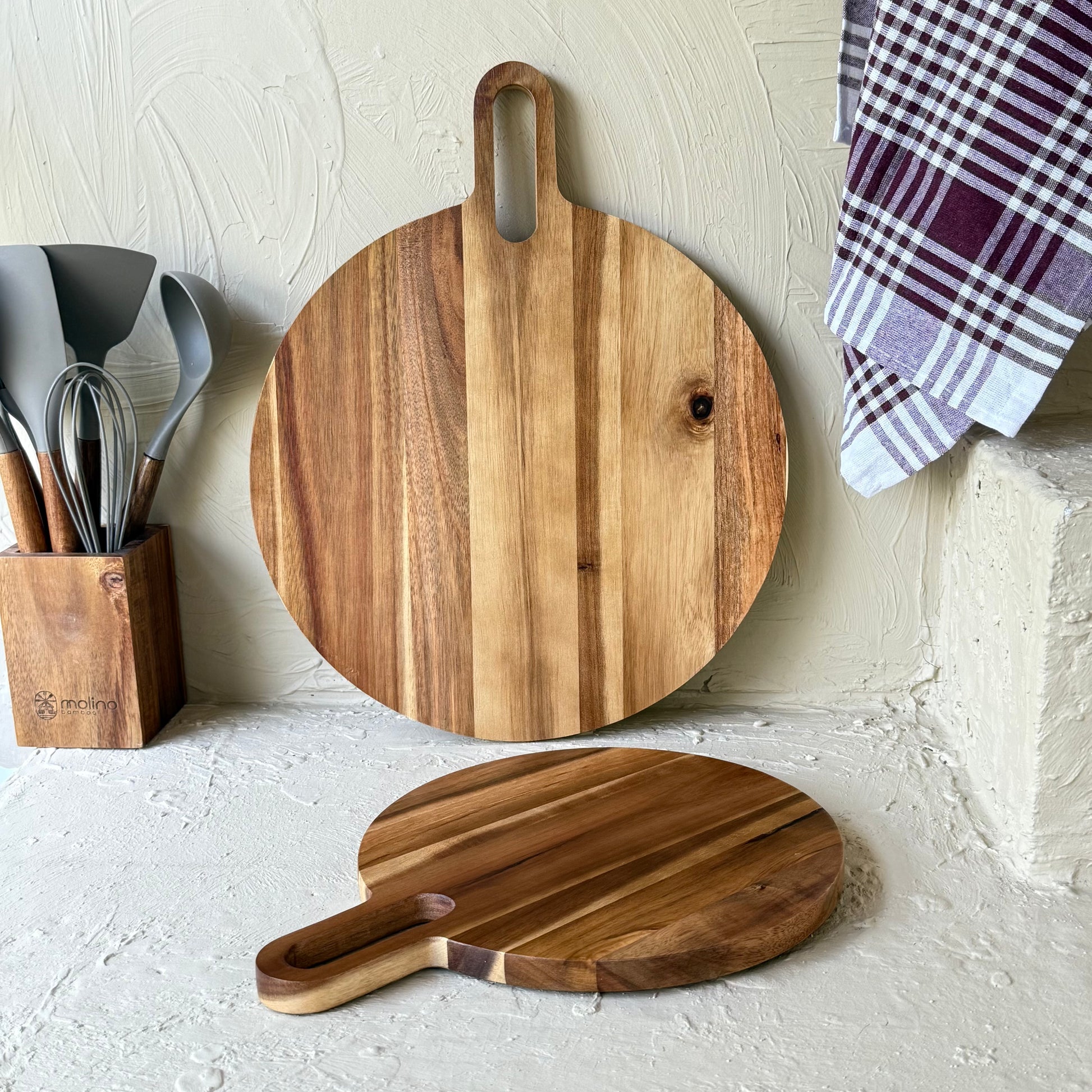 Arow Akasya Ağacı Yuvarlak Tutmalı İki Boy Kesme Tahtası KOD:0916-17
