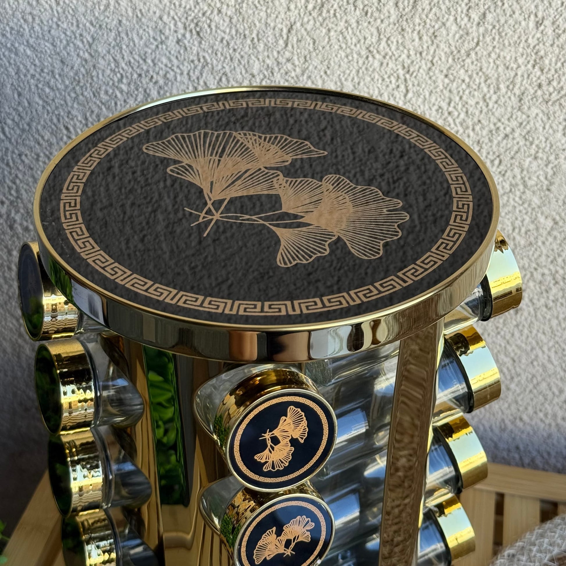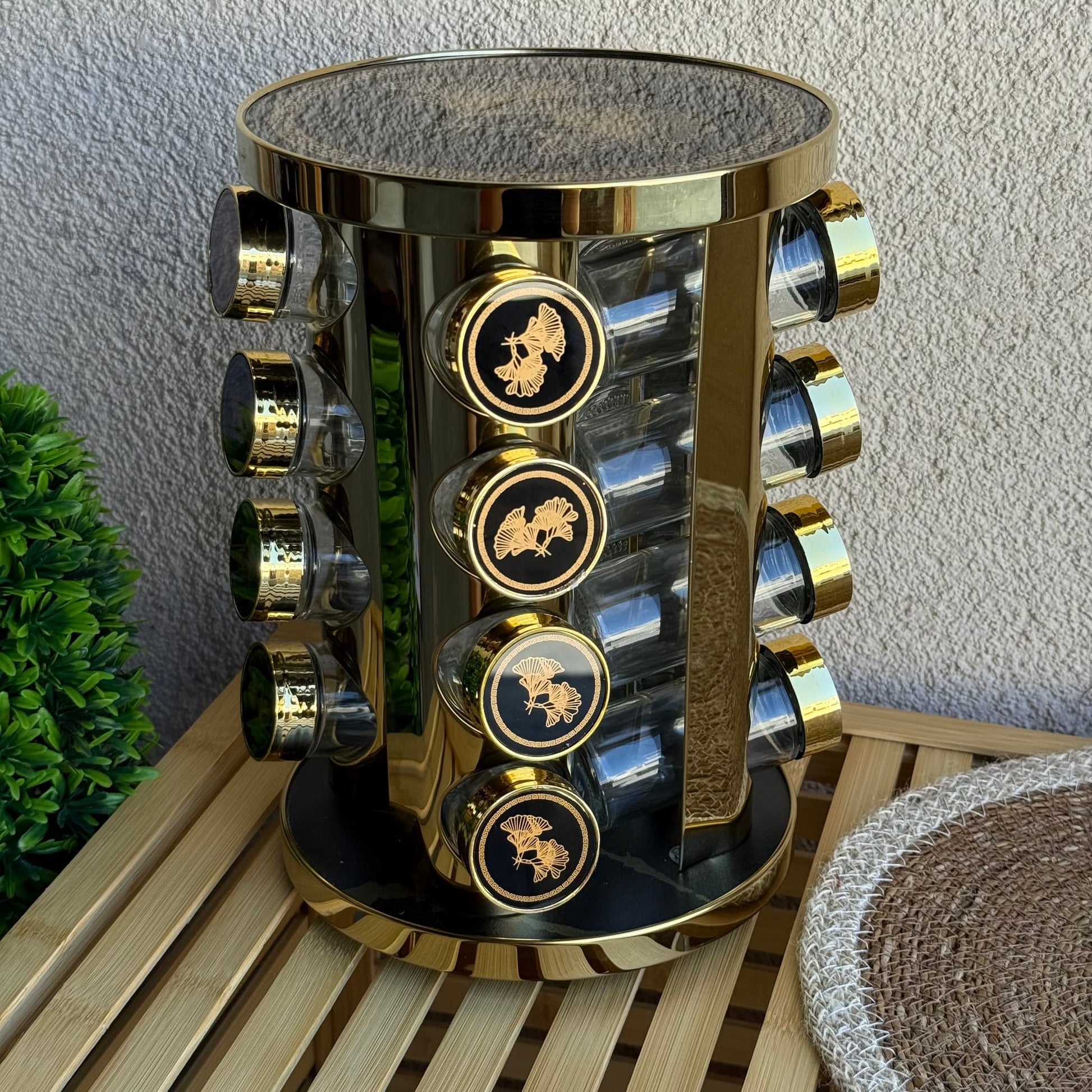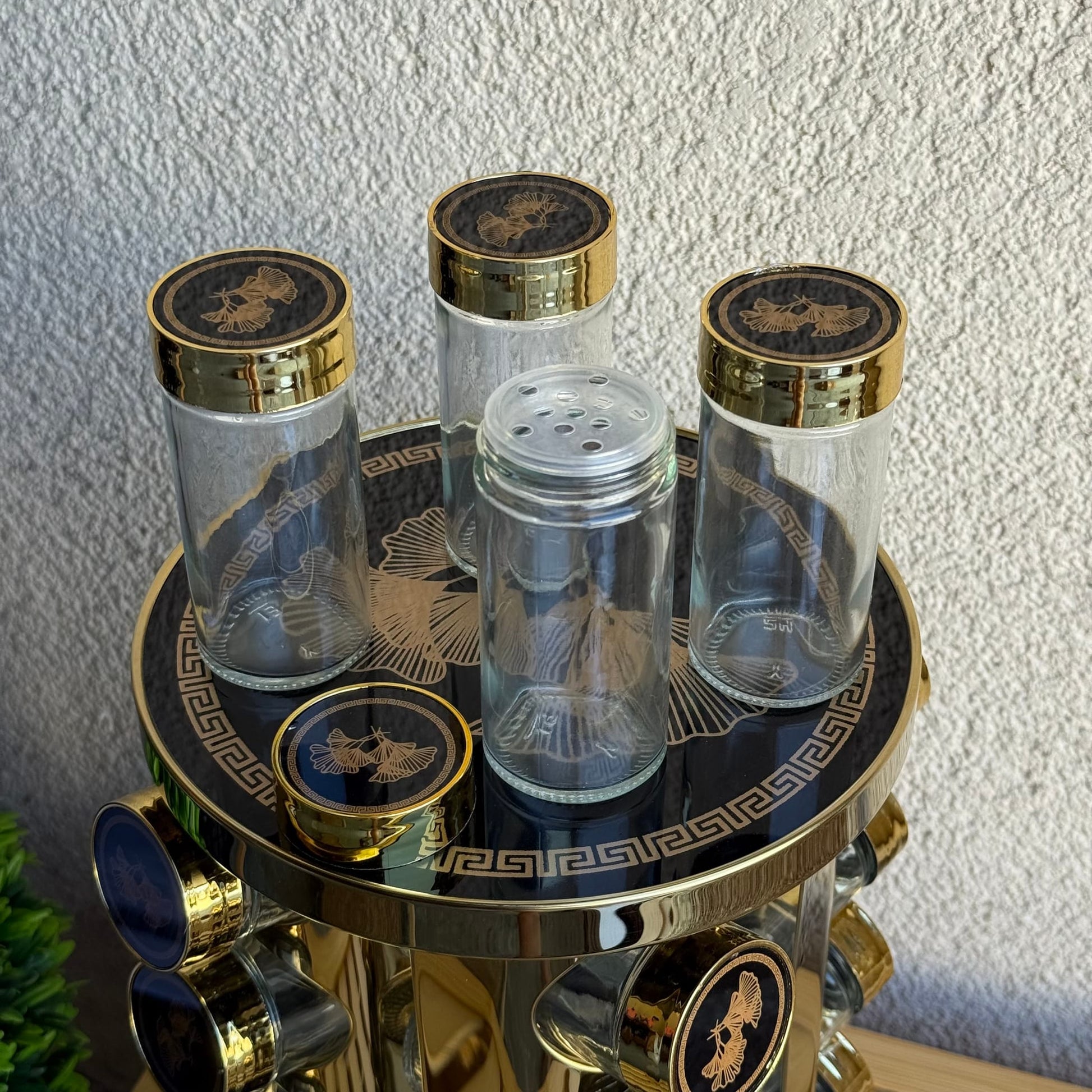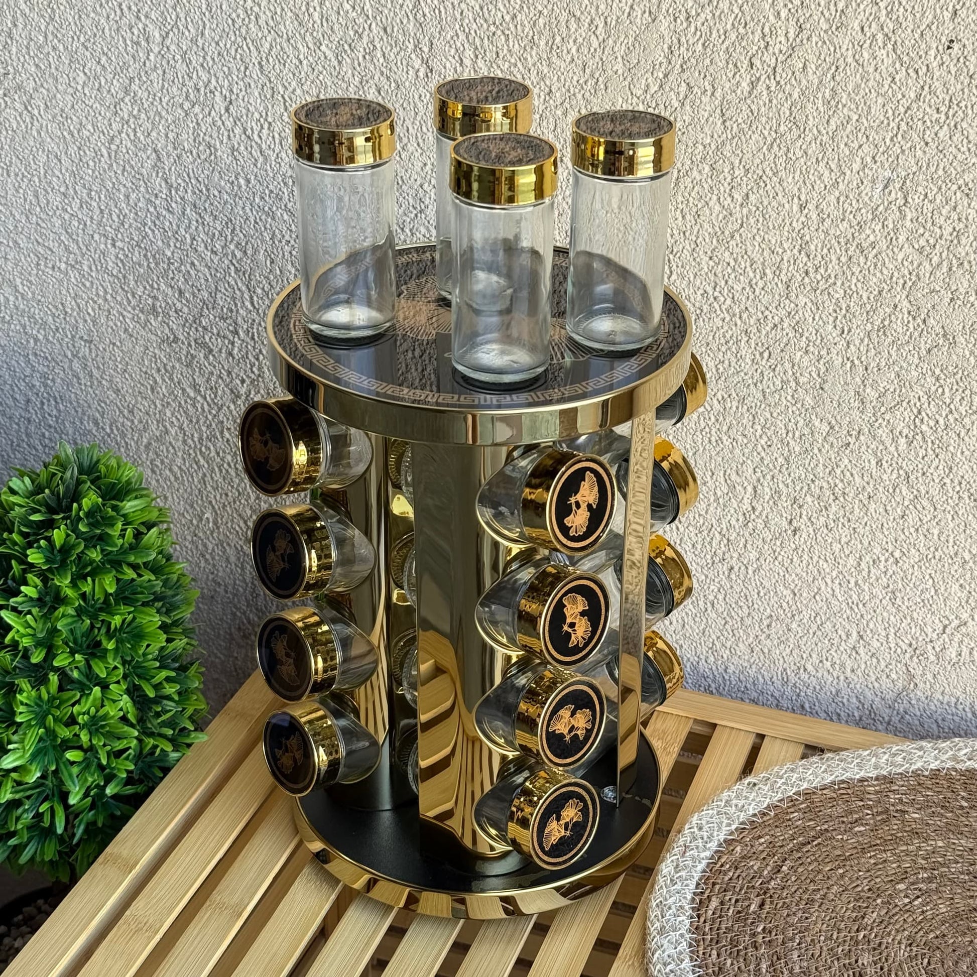 Dönen Standlı 16 Adet Cam Bahartalık Seti Siyah-Gold Detaylı (KOD: 4792)