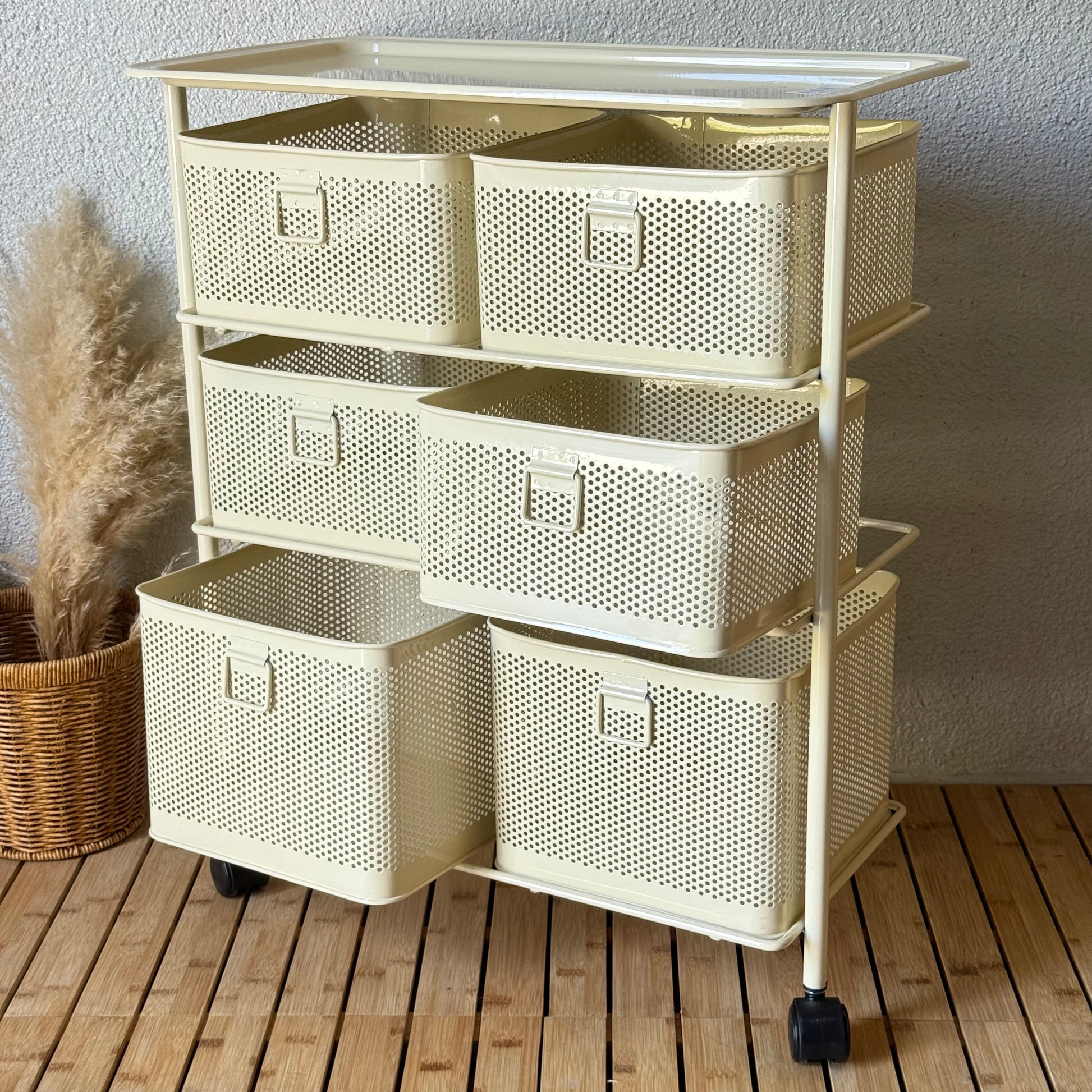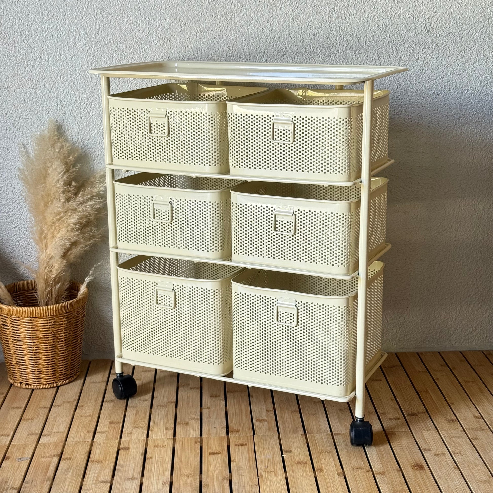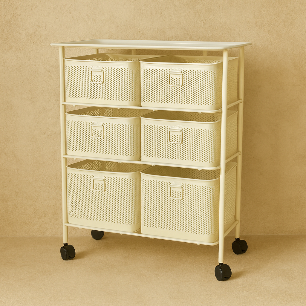 Evanev 3 Katlı Açılır Kapanır 6 Çekmeçeli Tekerlekli Kare Ferforje Sebzelik Krem KOD:1059T