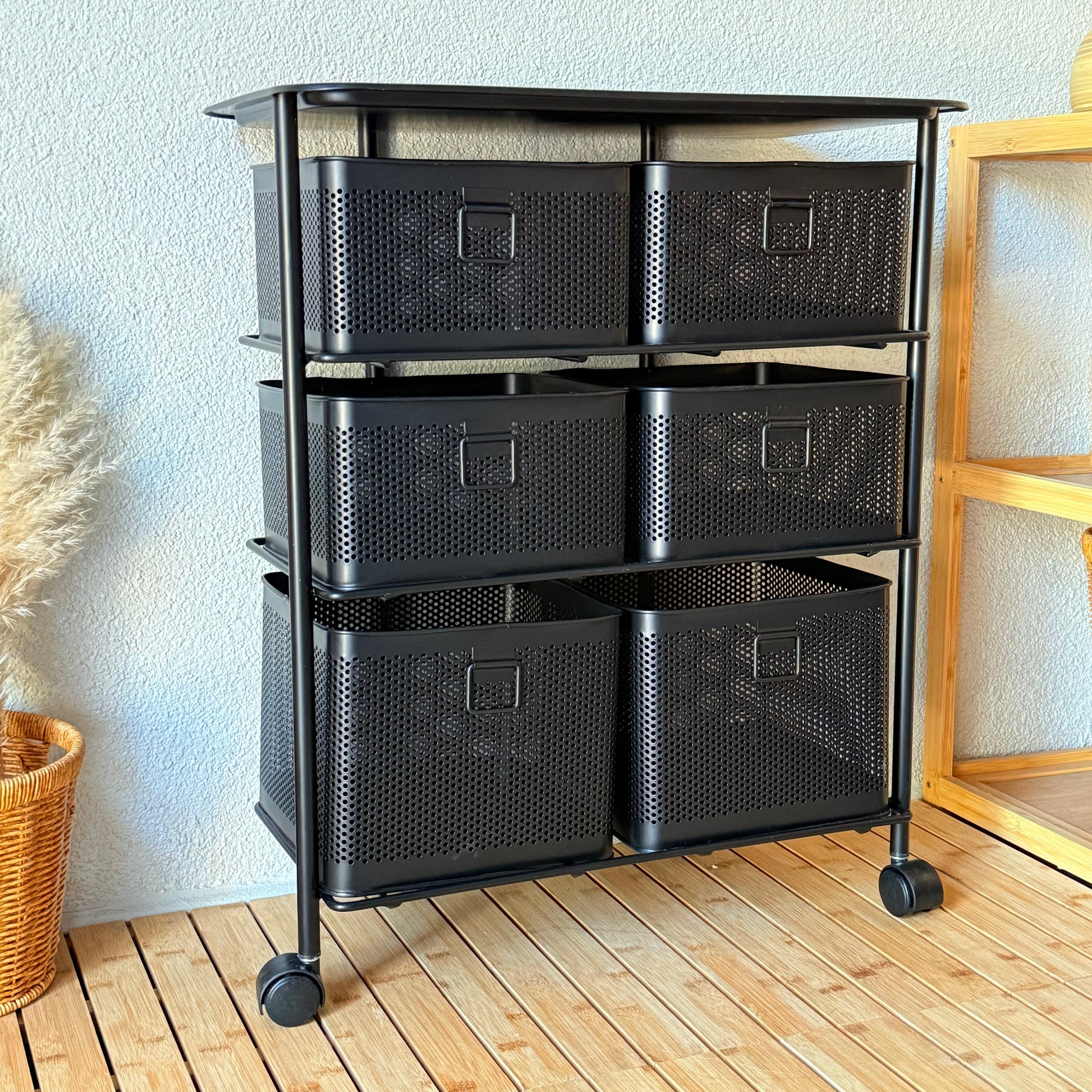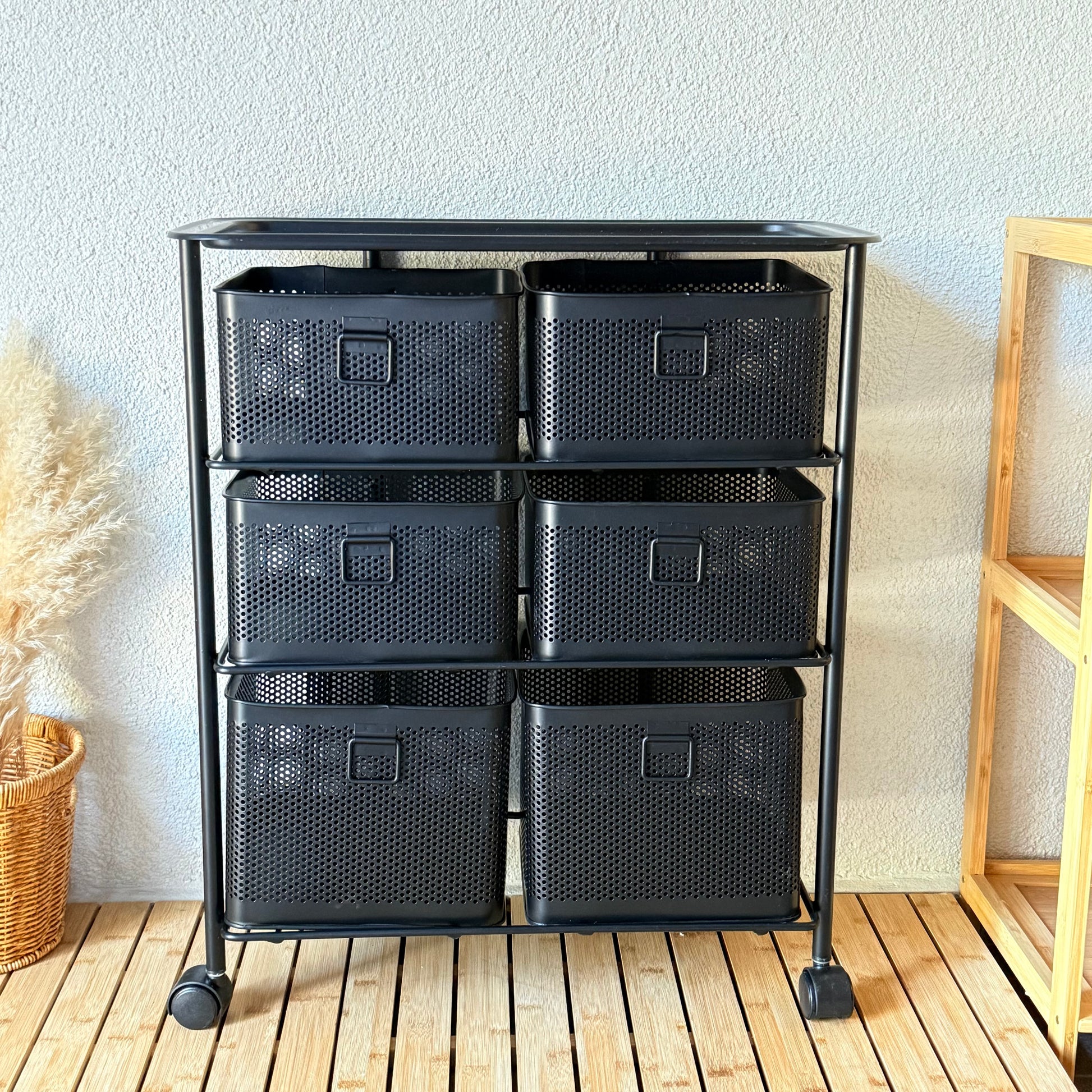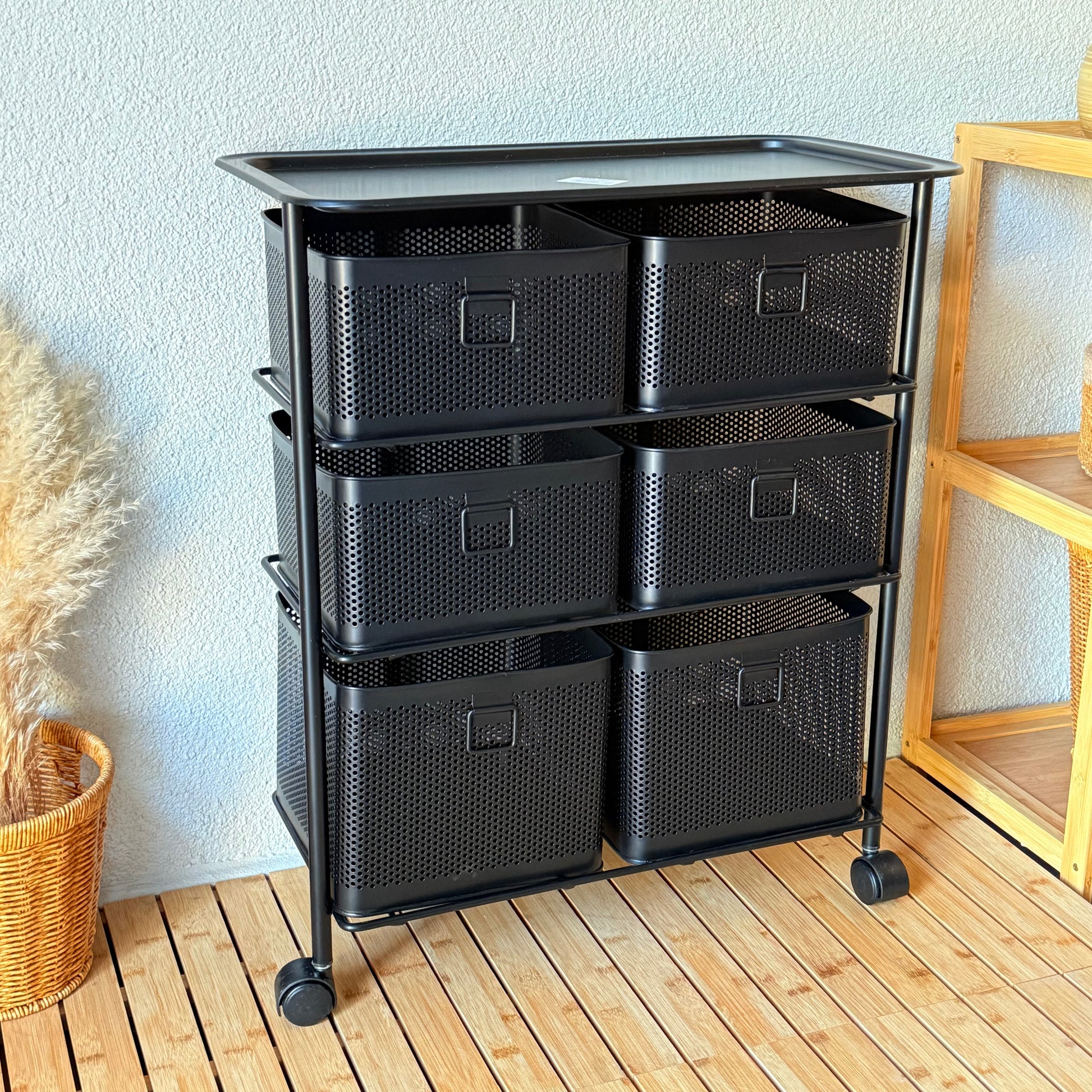 Evanev 3 Katlı Açılır Kapanır 6 Çekmeçeli Tekerlekli Kare Ferforje Sebzelik Siyah KOD:1059T