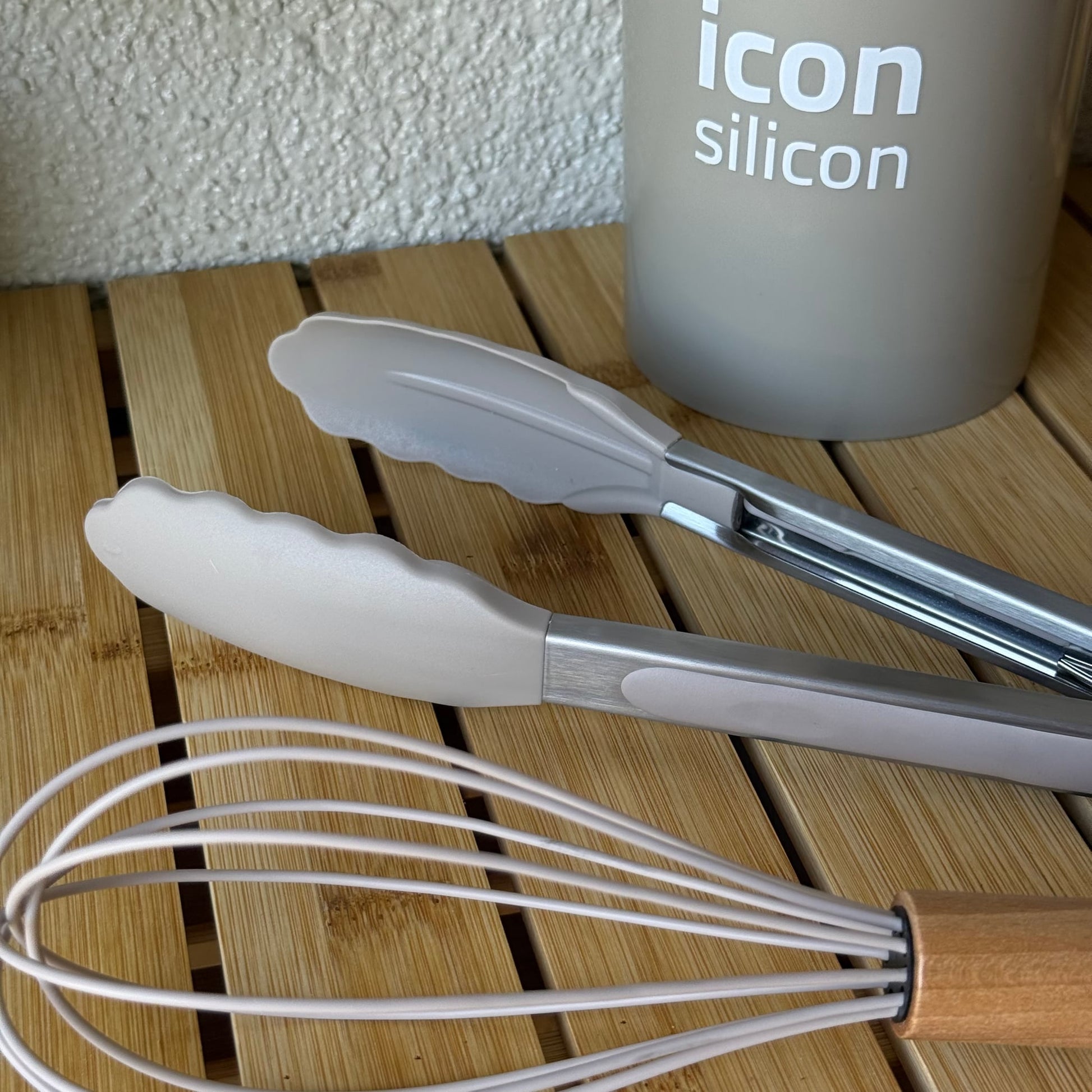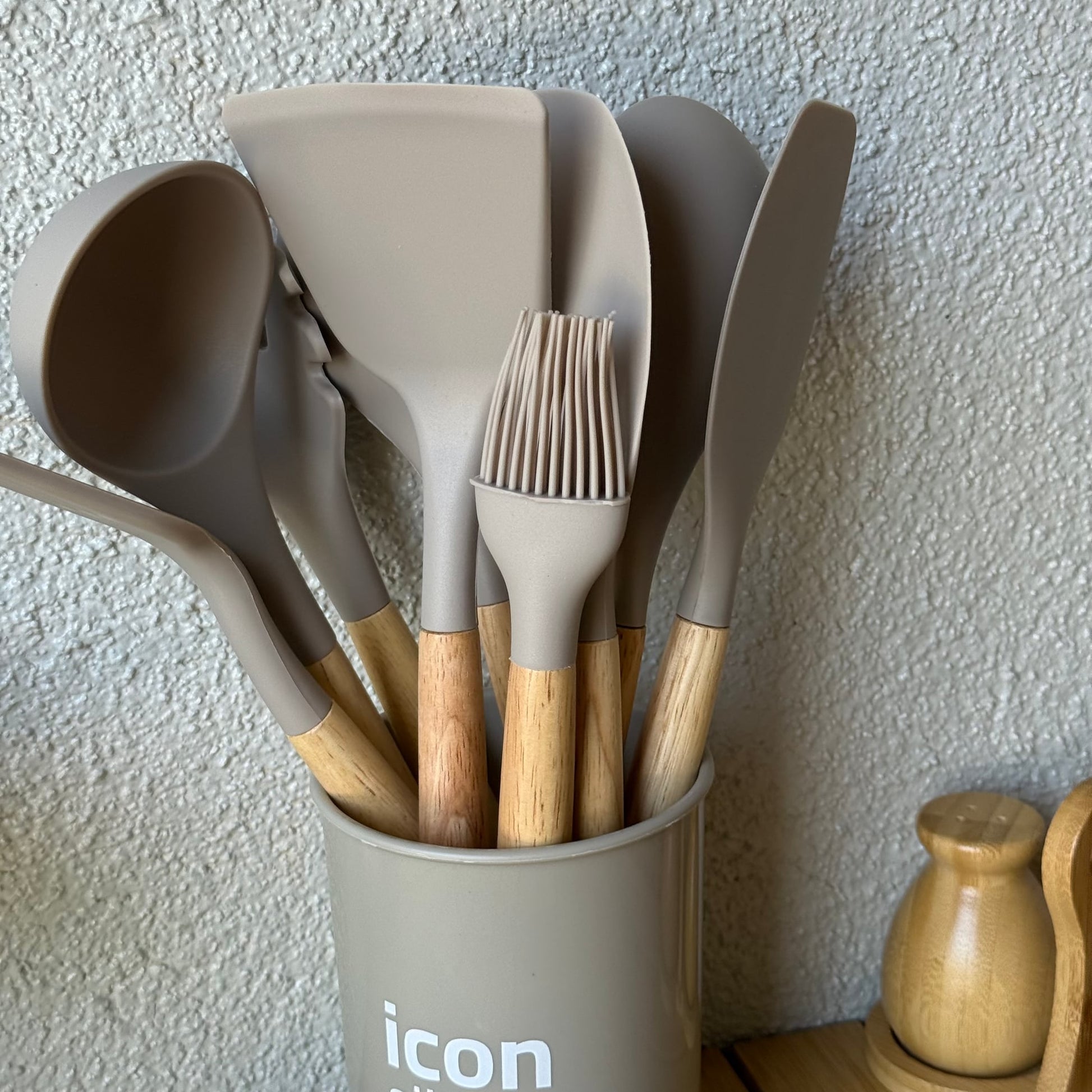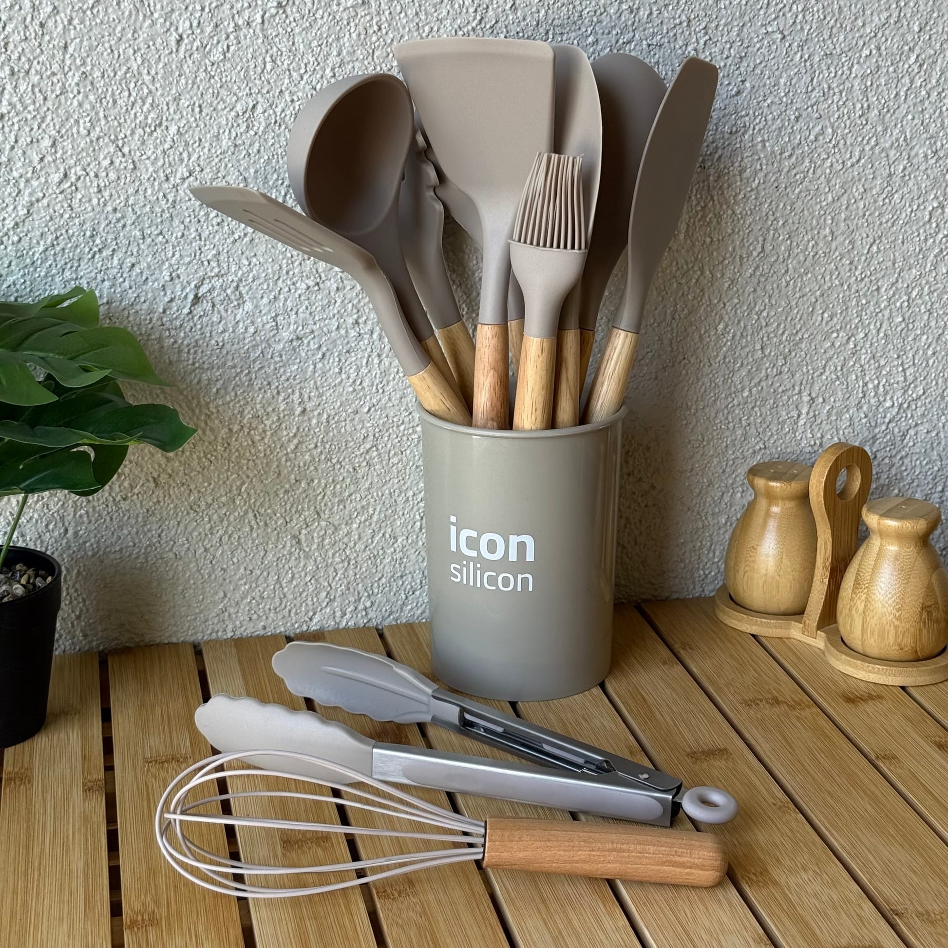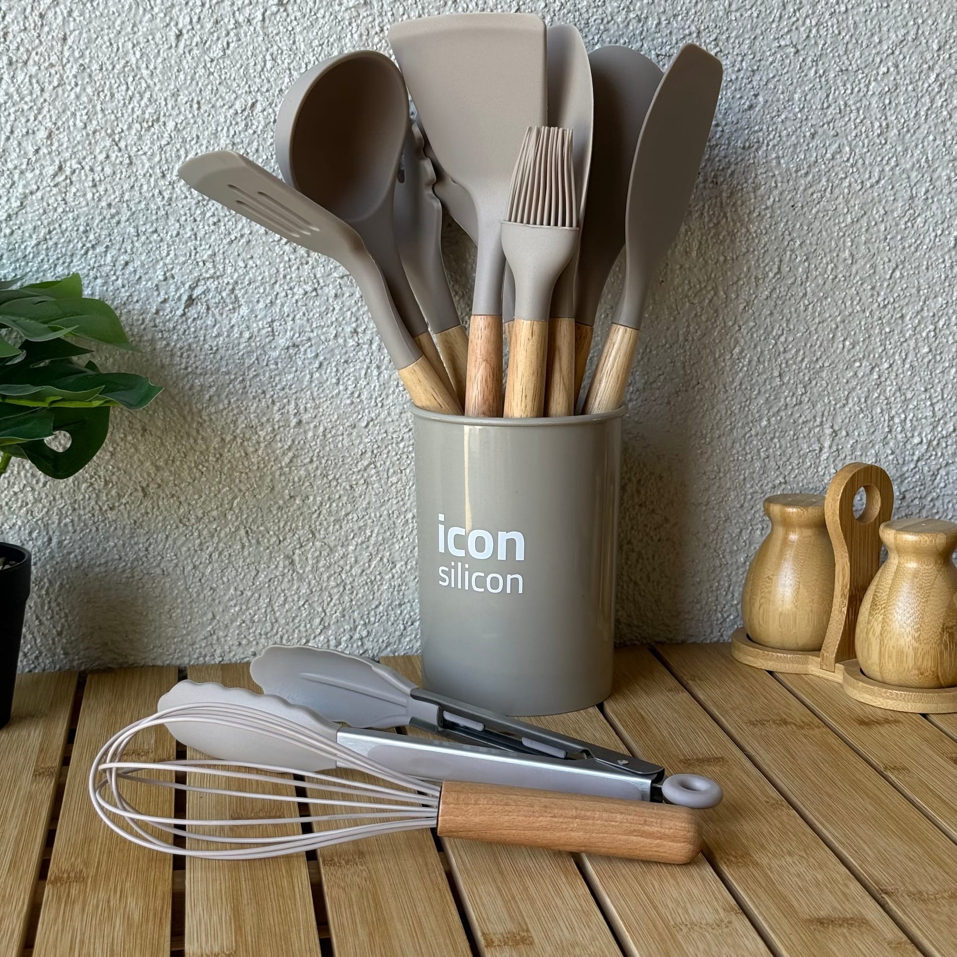İcon Standlı Bambu Saplı Silikon 12 Parça Mutfak Seti Bej