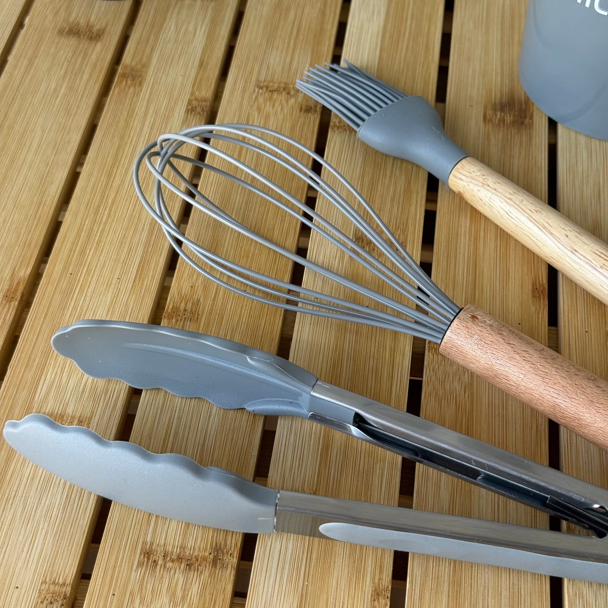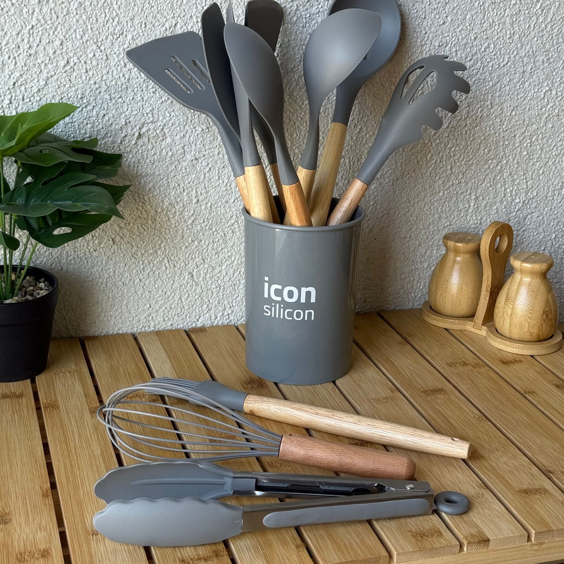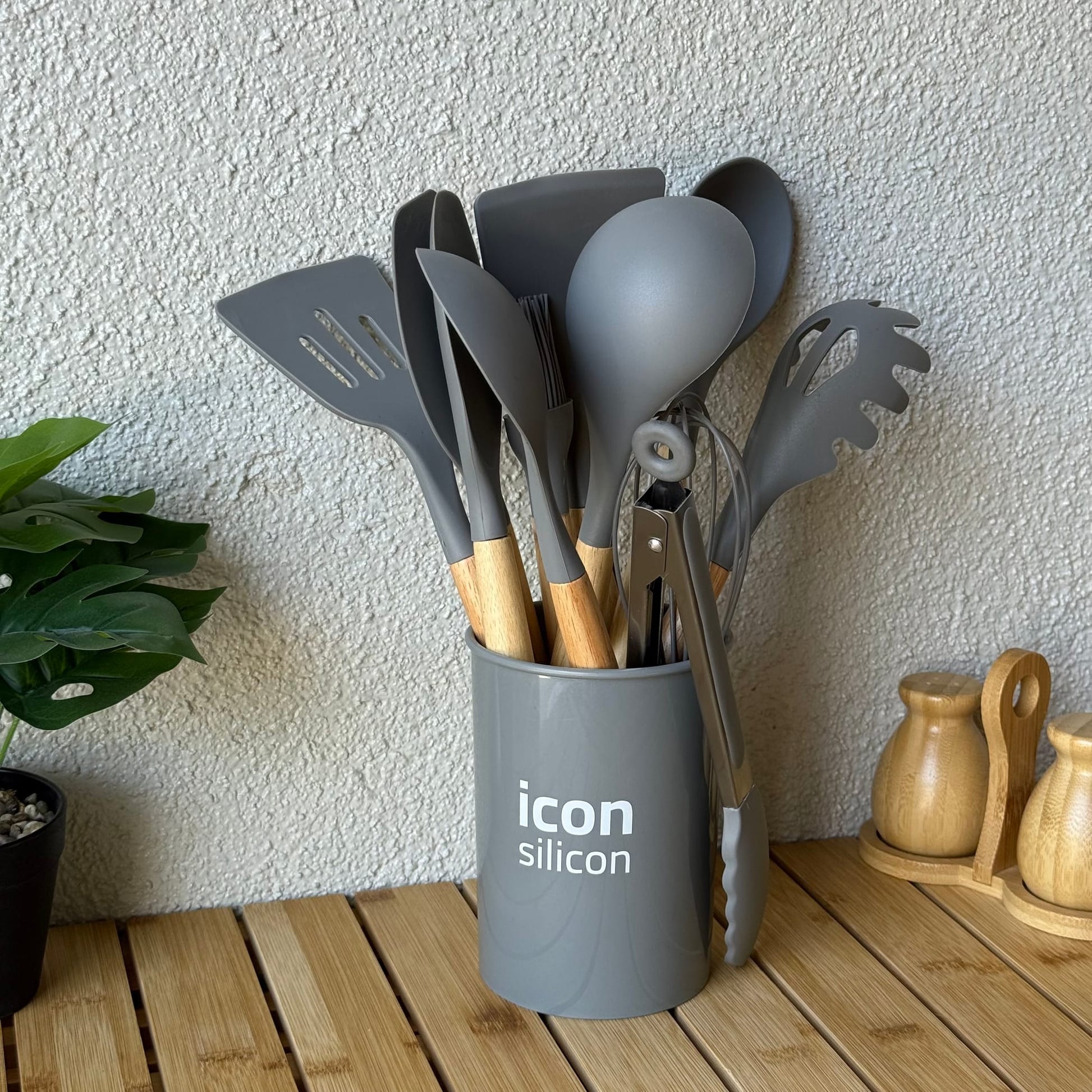 İcon Standlı Bambu Saplı Silikon 12 Parça Mutfak Seti Gri