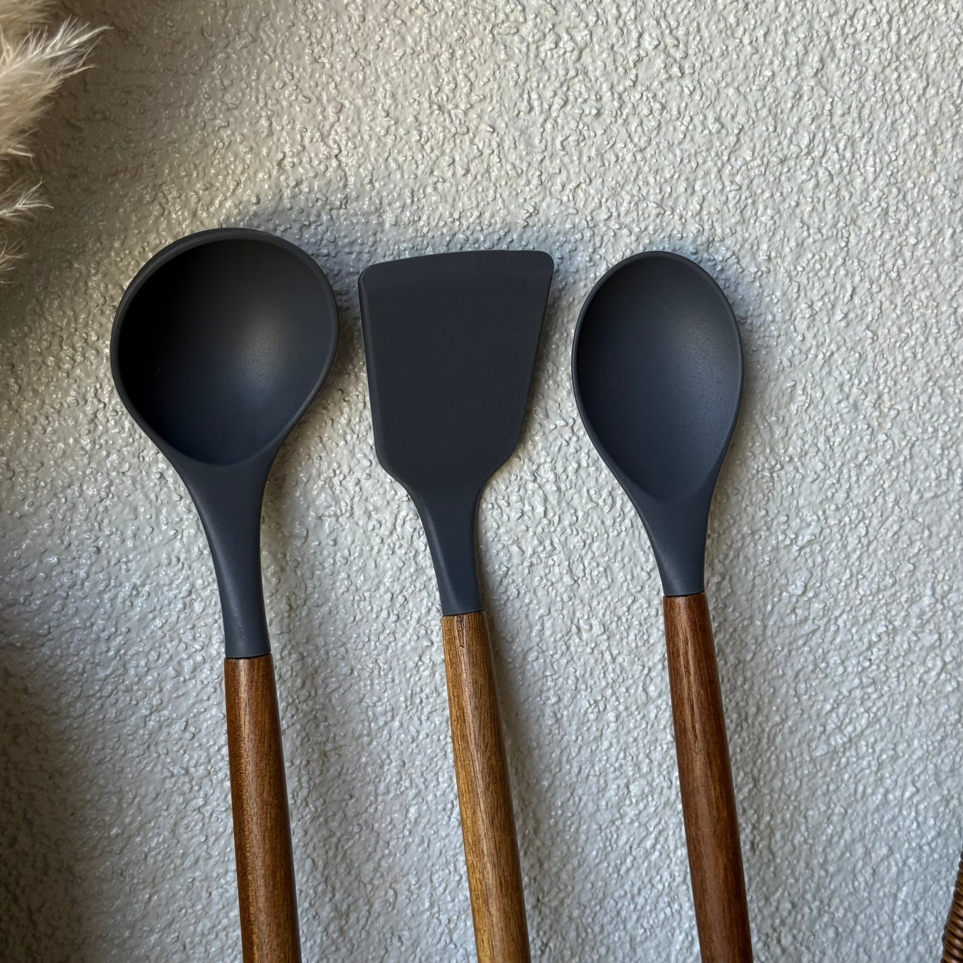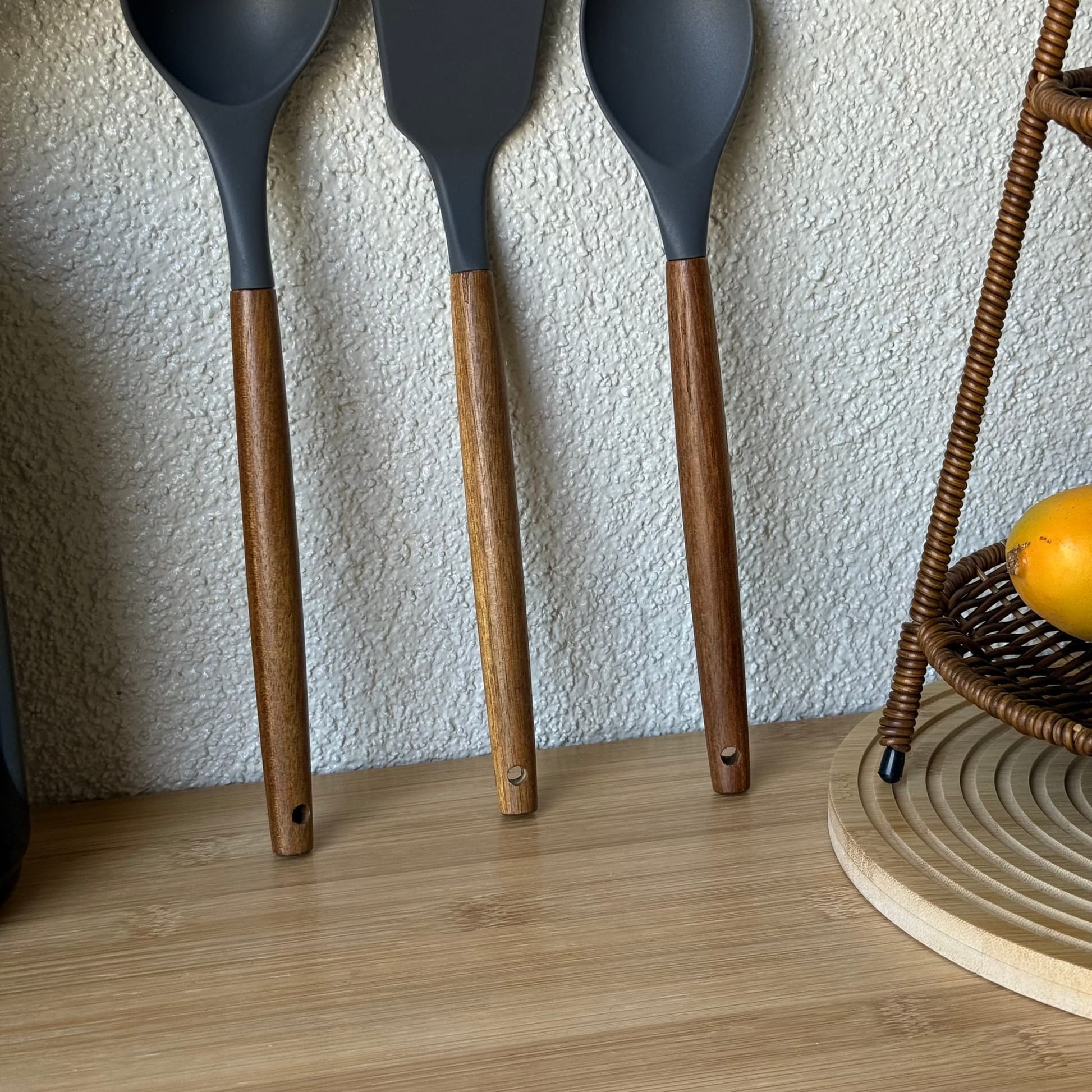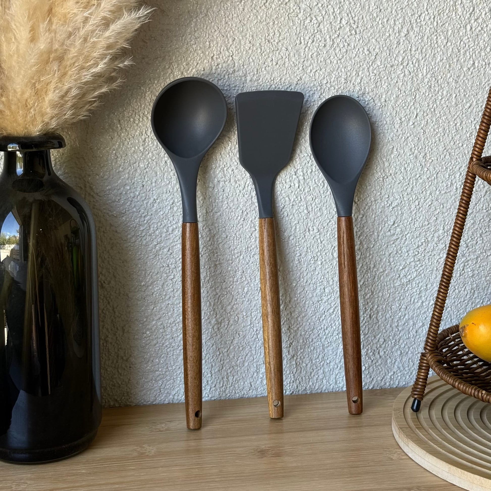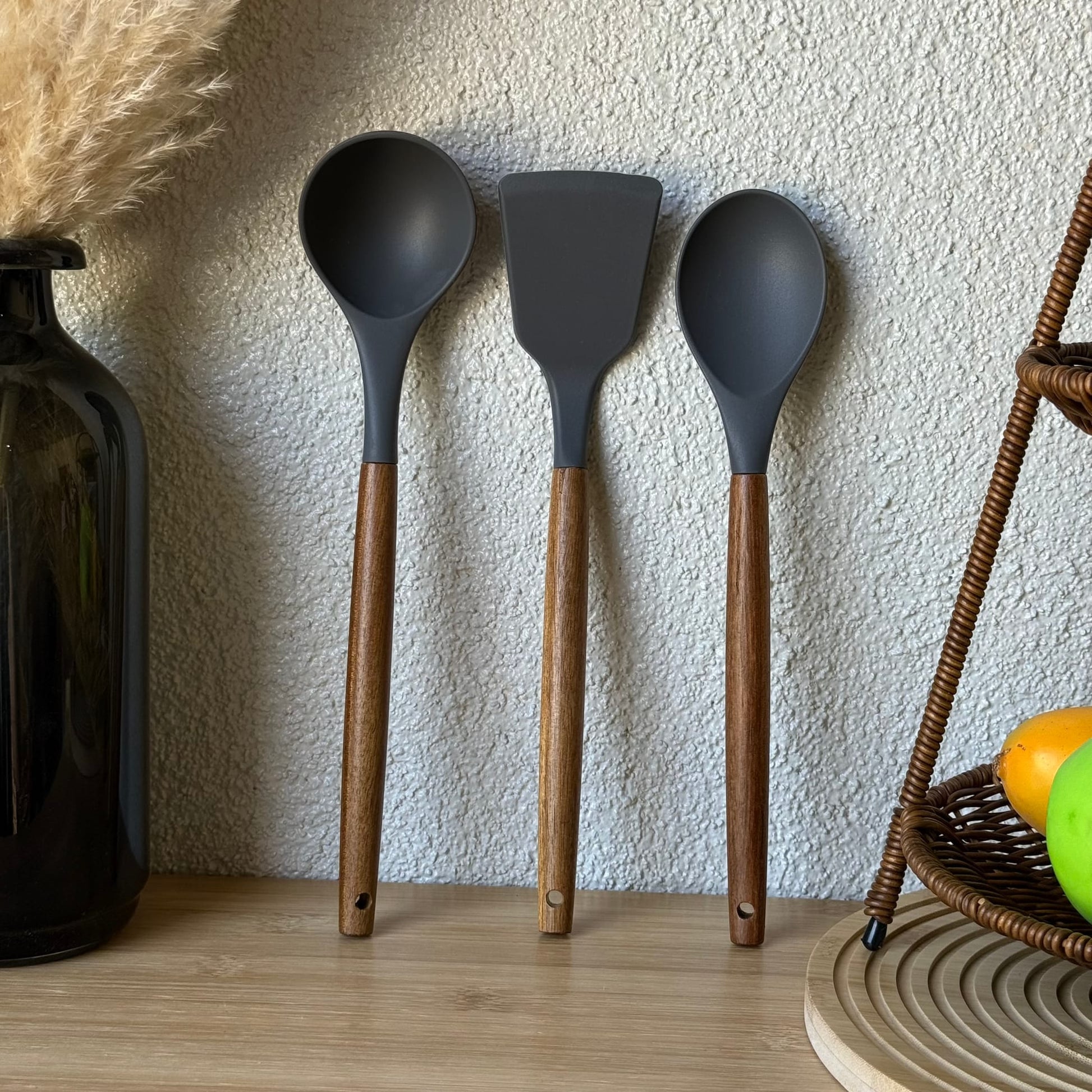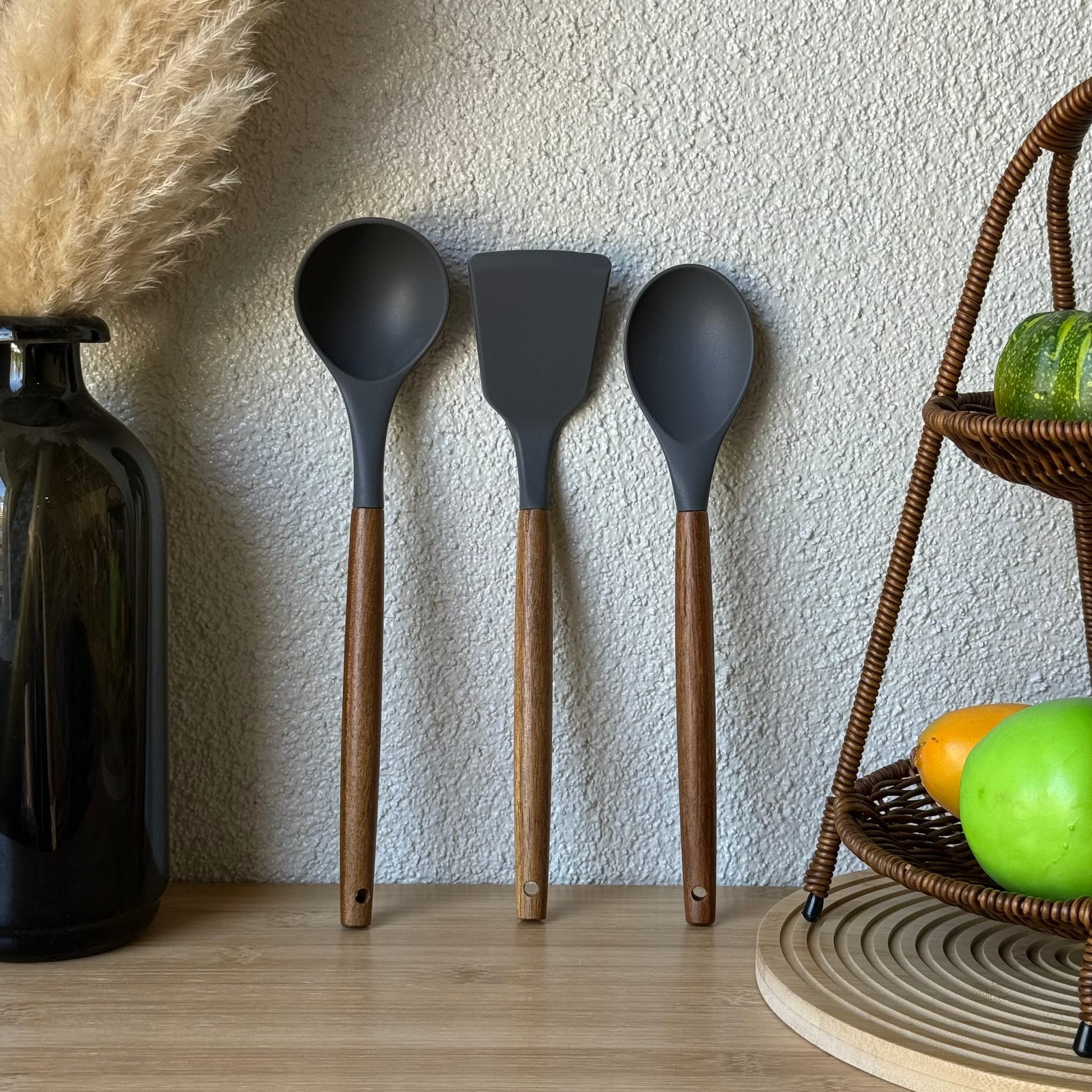 Leon Akasya Ağacı Tutmalı Silikon Kepçe Seti 3 Parça Koyü Gri