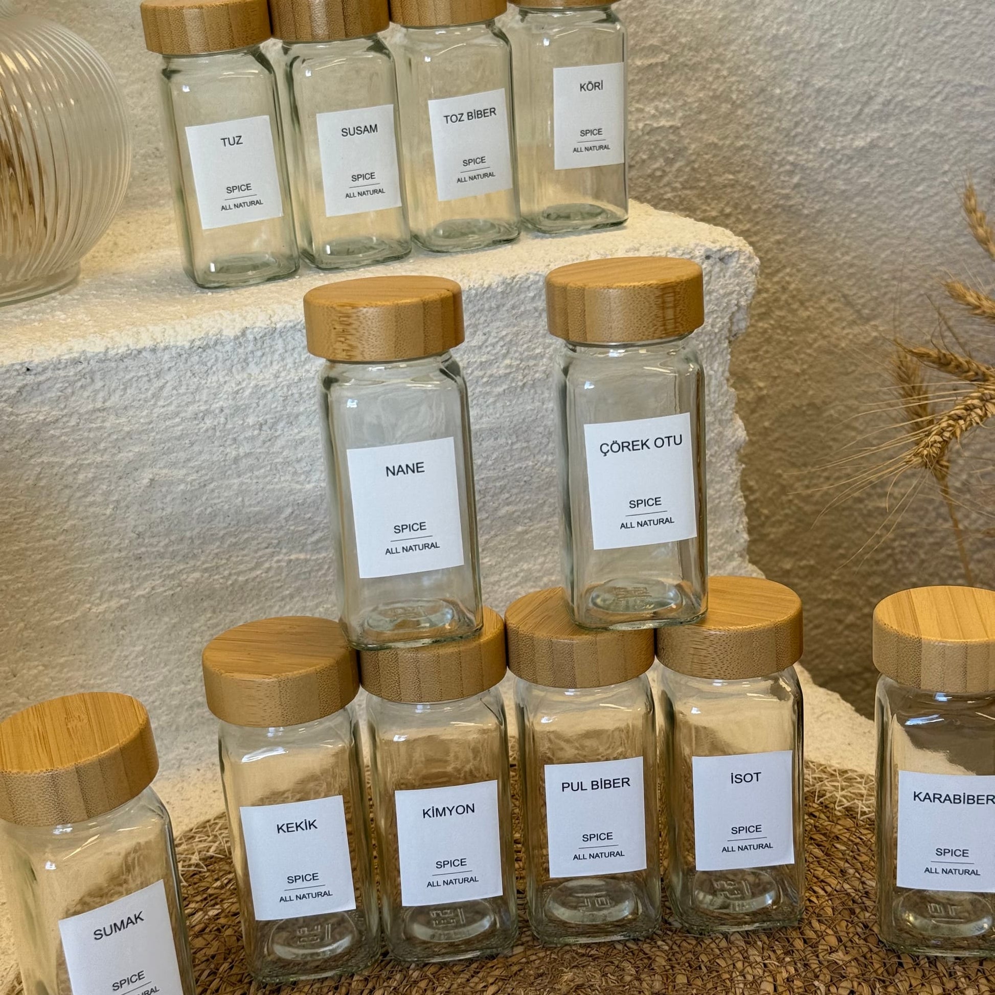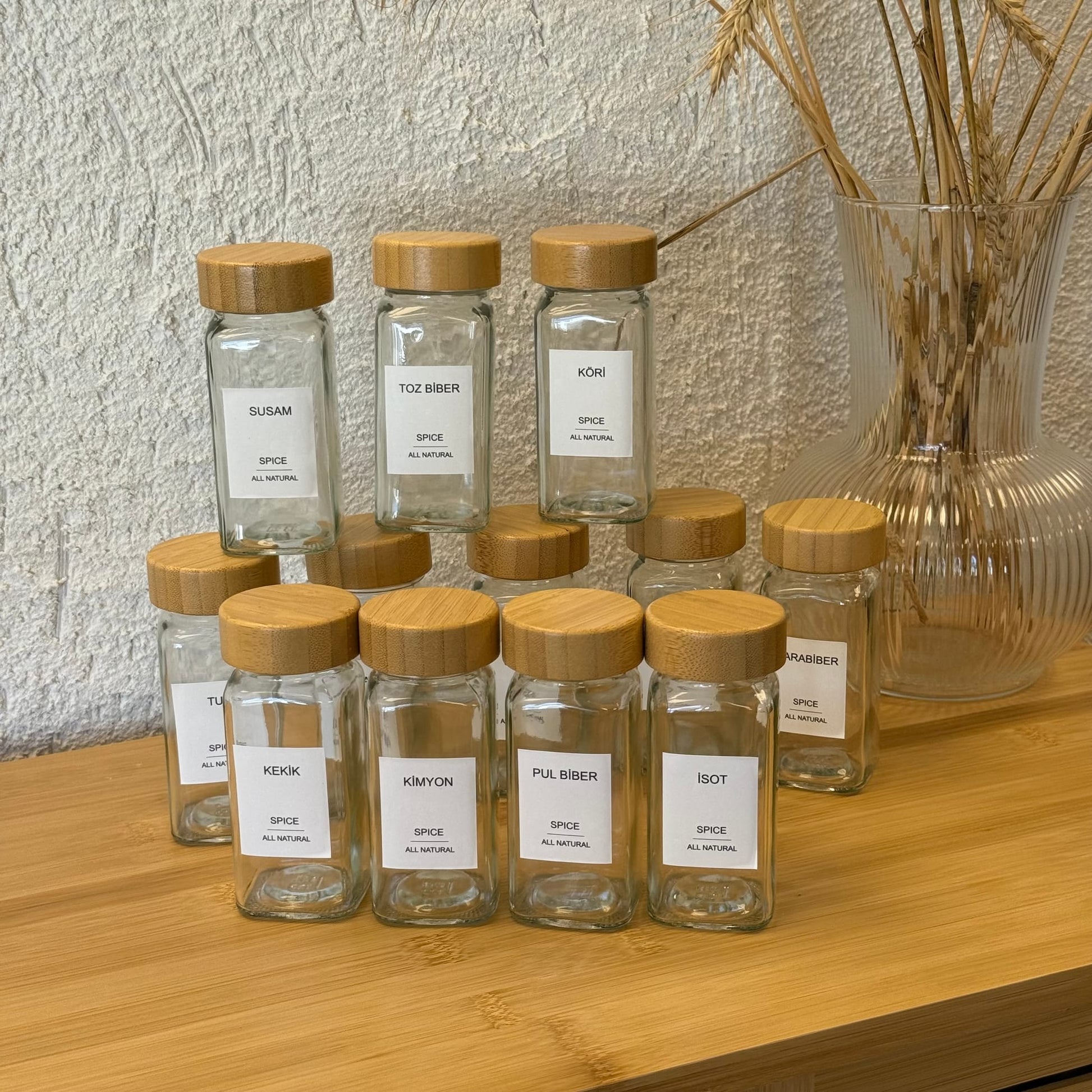 Mien 12 Adet Kare Bambu Kapaklı Cam Baharatlık Seti 120 ml (KOD-008)