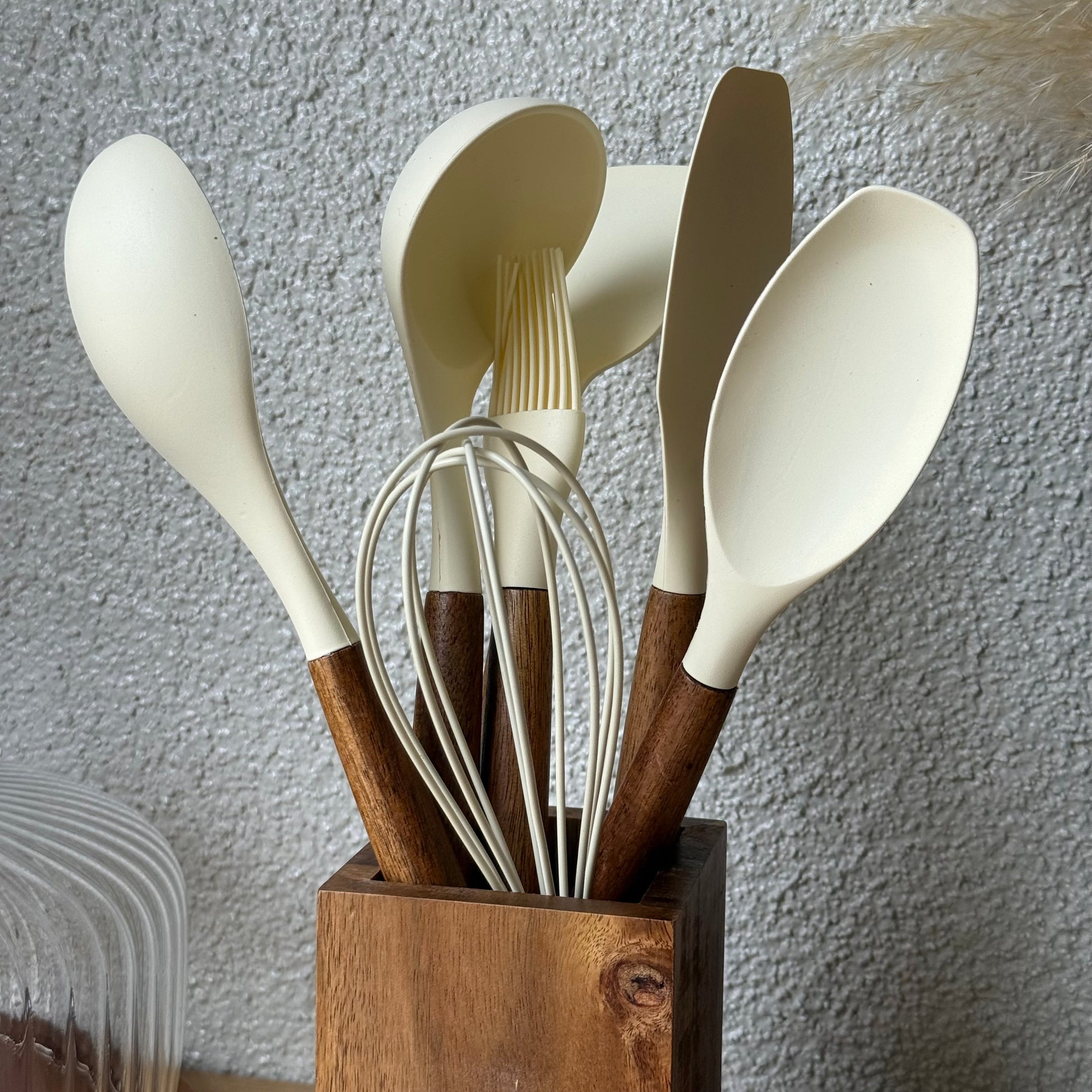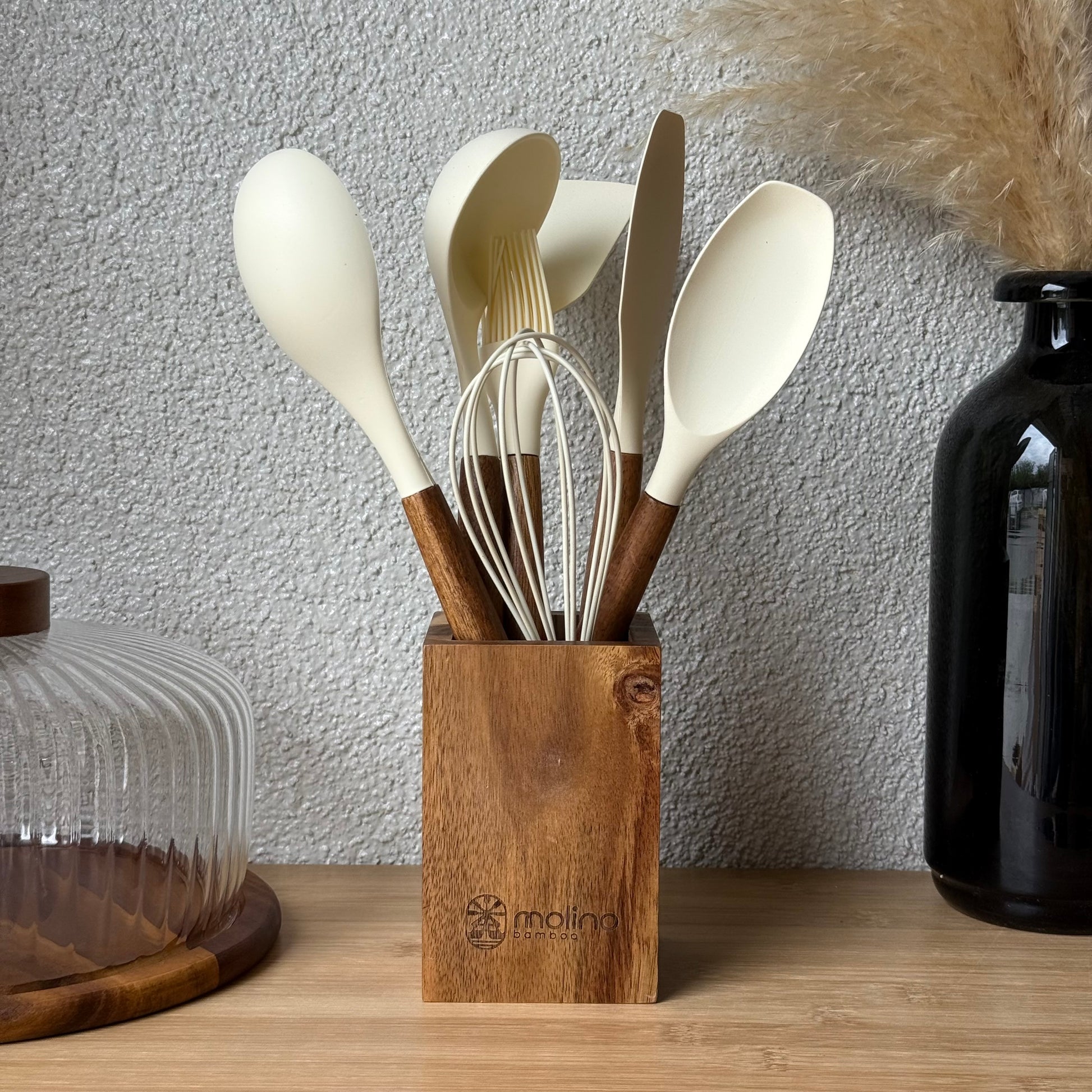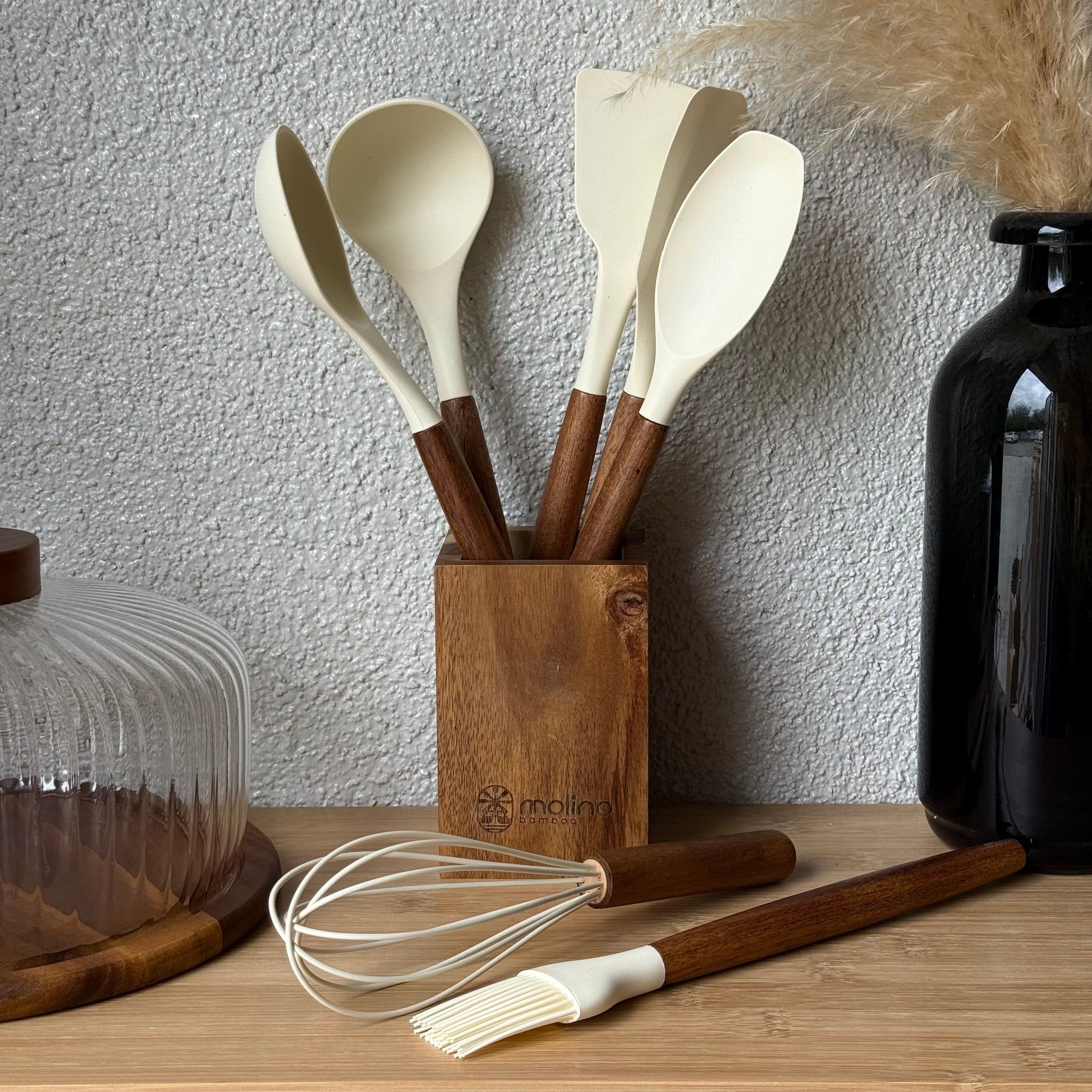 Molino Akasya Ağacı Standlı Silikon Mutfak Seti 8 Parça Krem