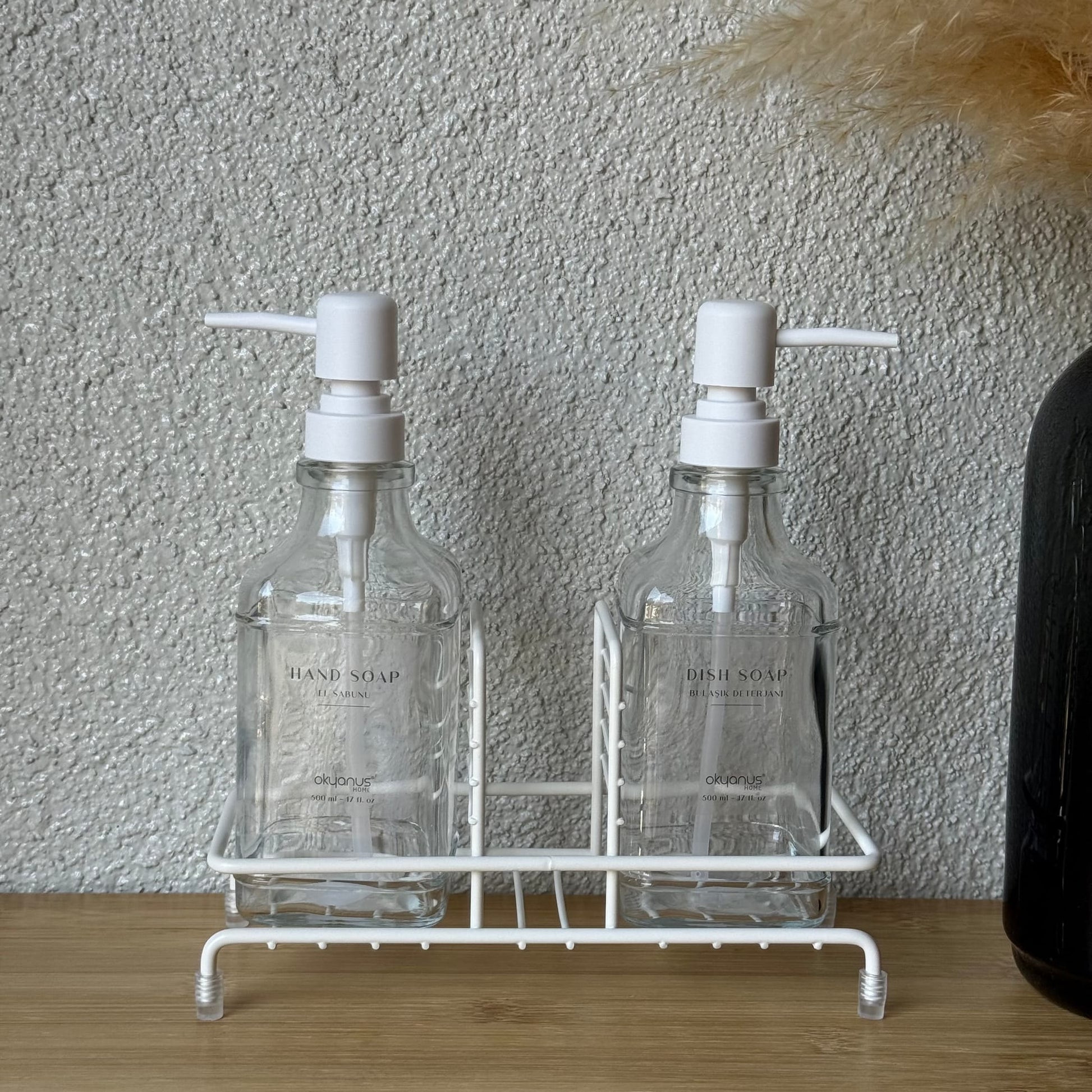 Okyanus Metal Standlı Cam Kare Sıvı Sabunluk Seti Beyaz