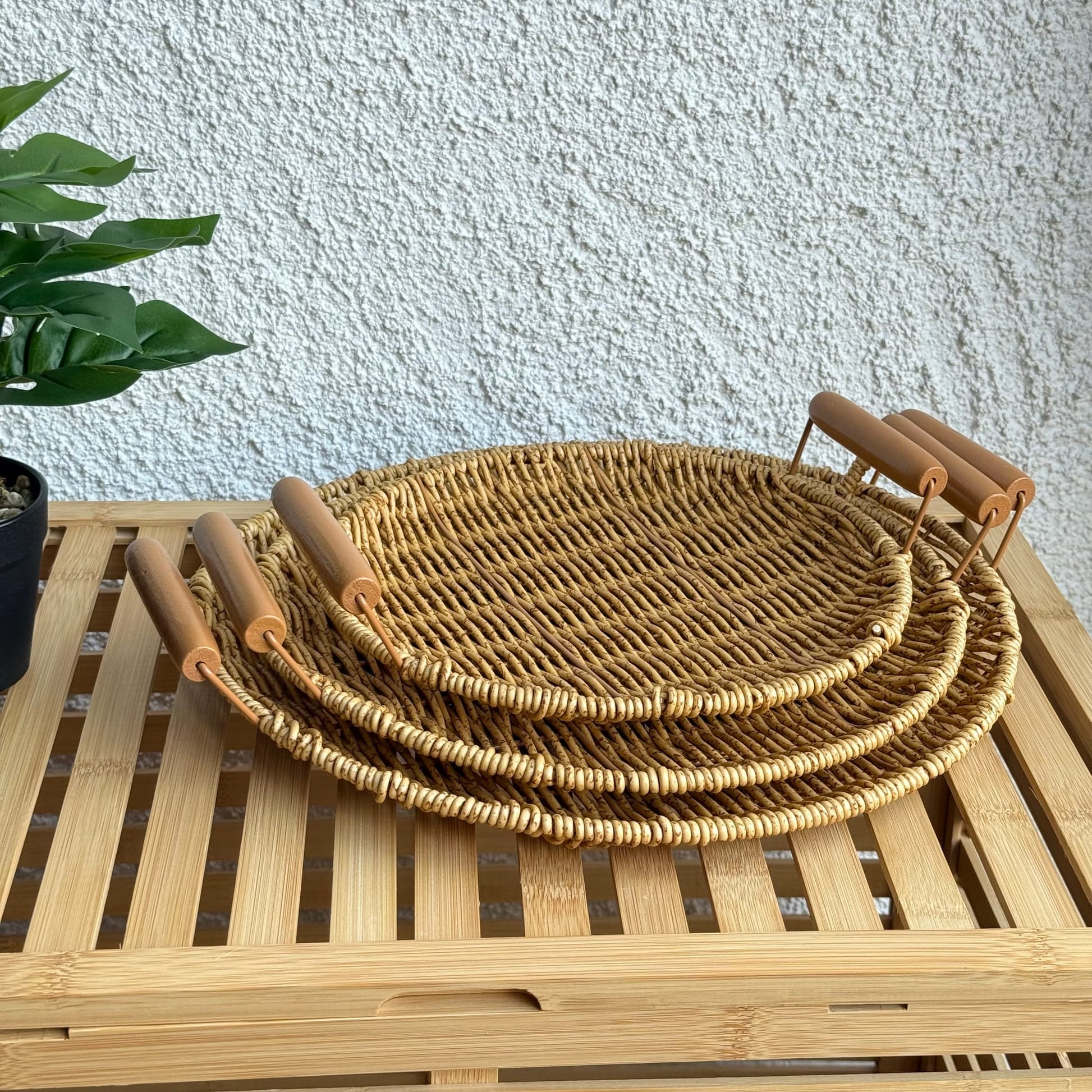 Rios Rattan Kulplu 3 Boy Yuvarlak Tepsi Seti Naturel