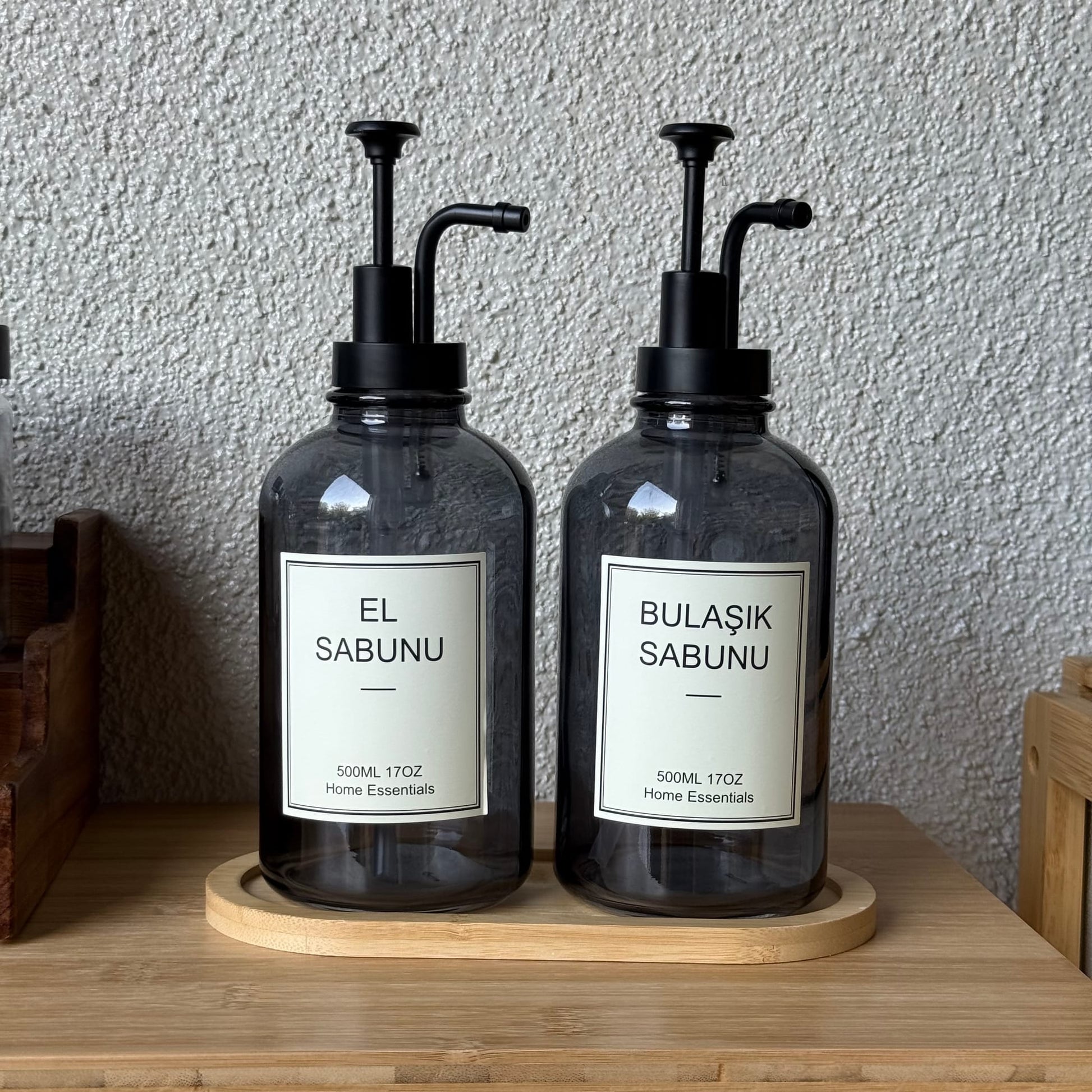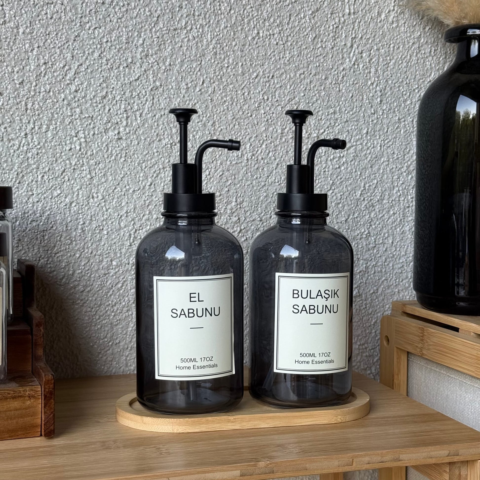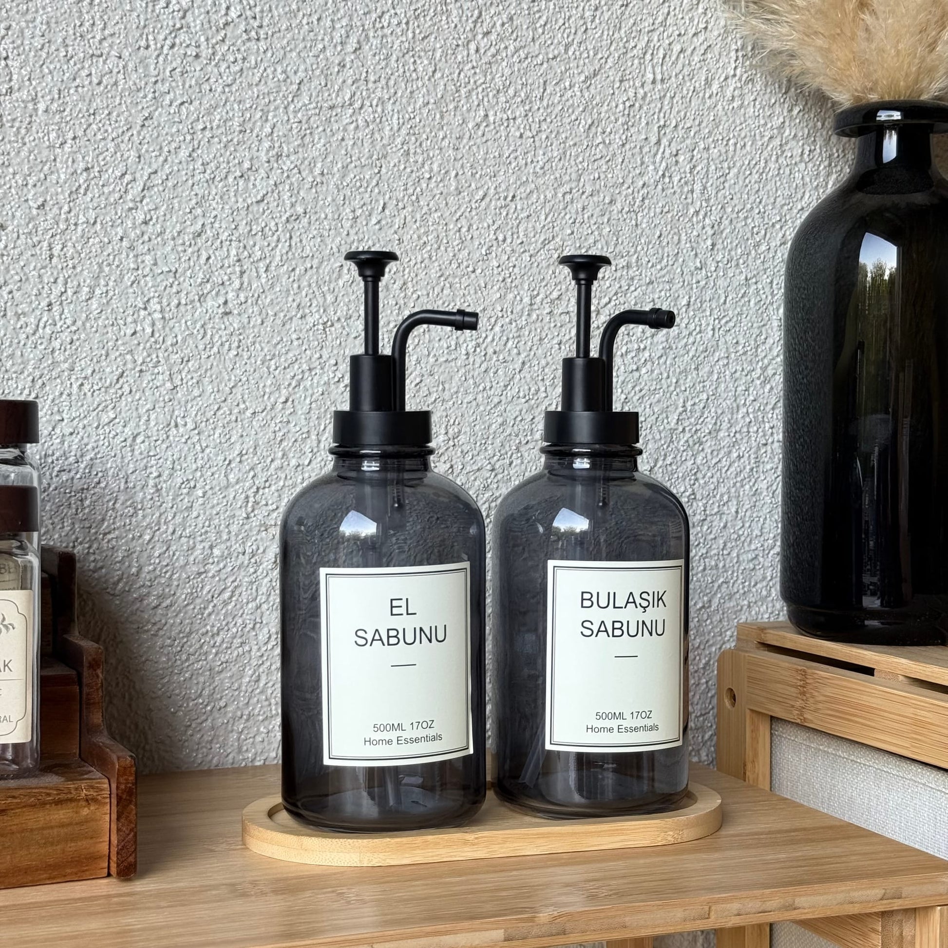 Selena Bambu Standlı İkili Cam Yuvarlak Sıvı Sabunluk Seti Füme 500 ml