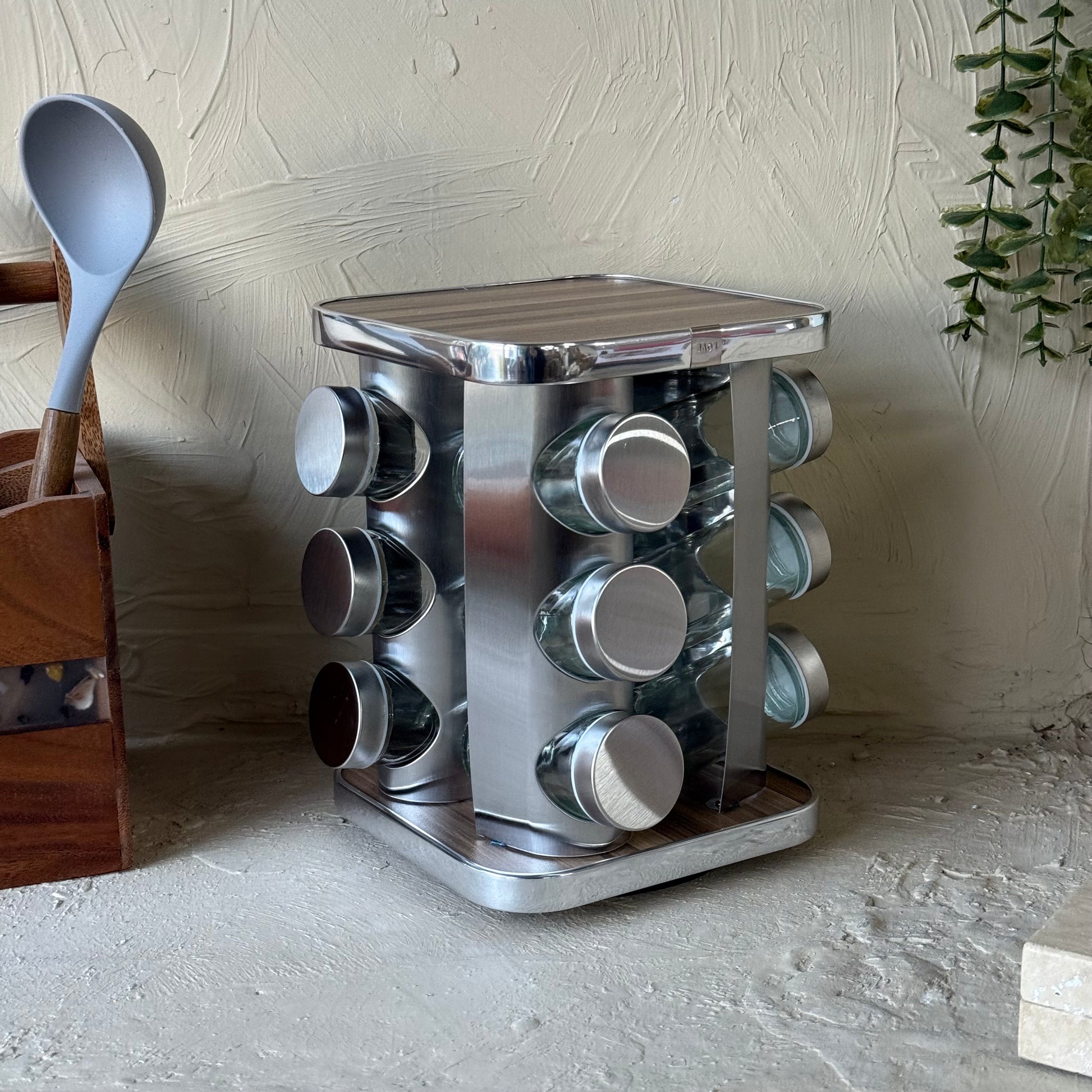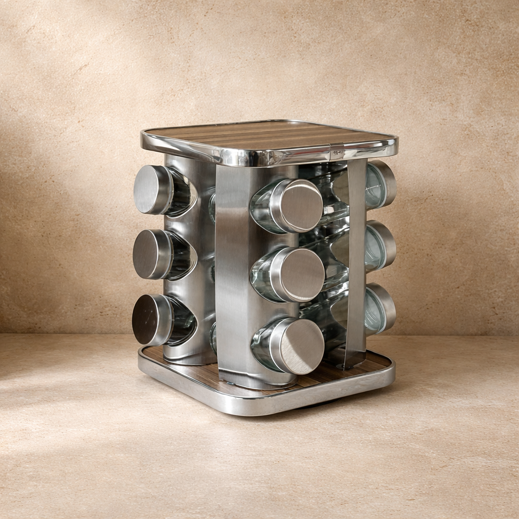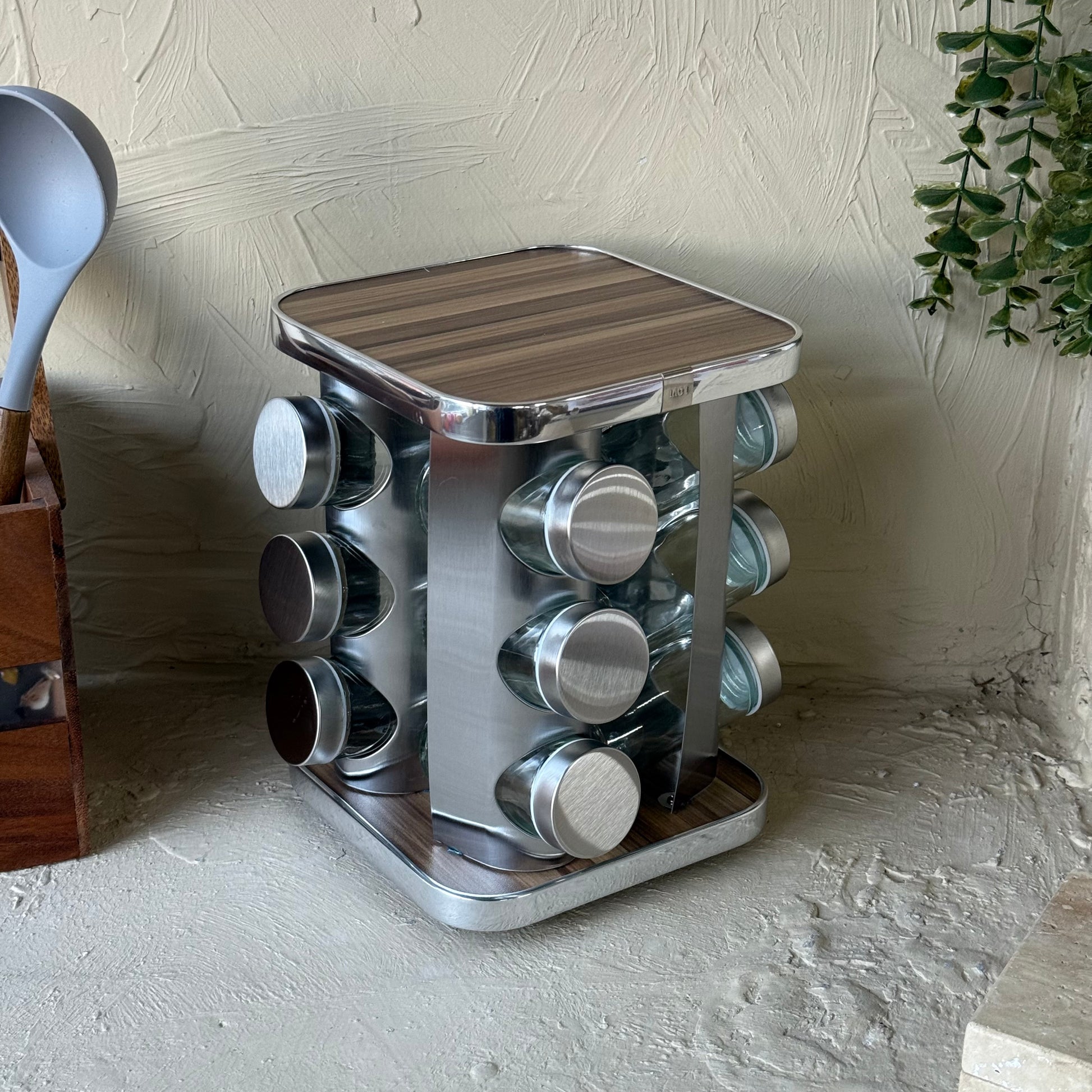 SVR Dönerli Standlı Kare Metal Kapaklı 12 Li Baharatlık Seti Ahşap-Gümüş KOD:710