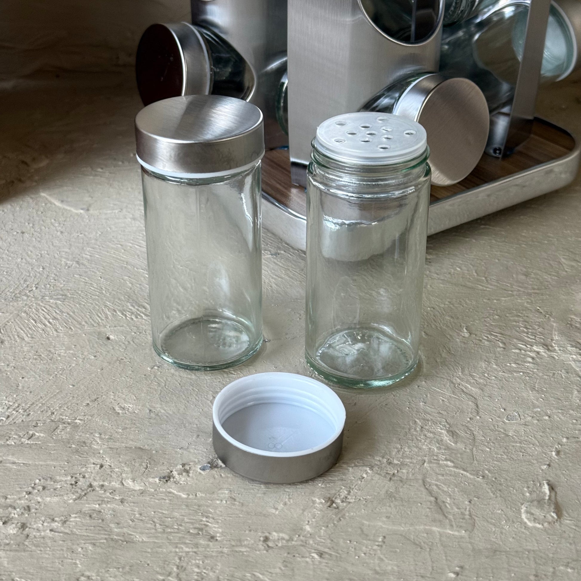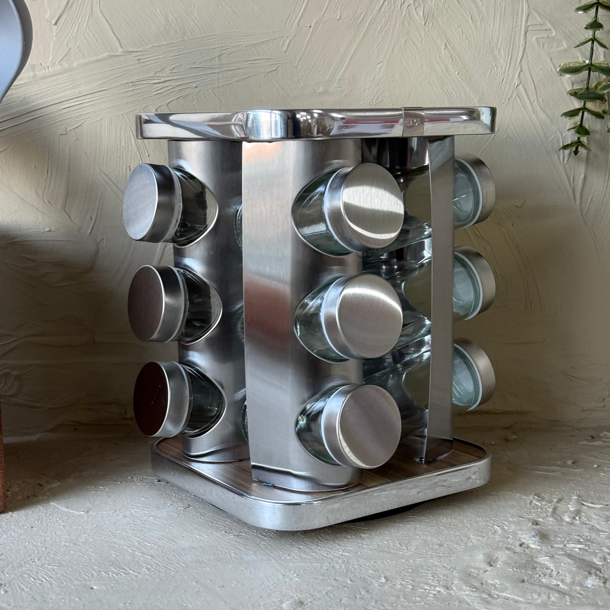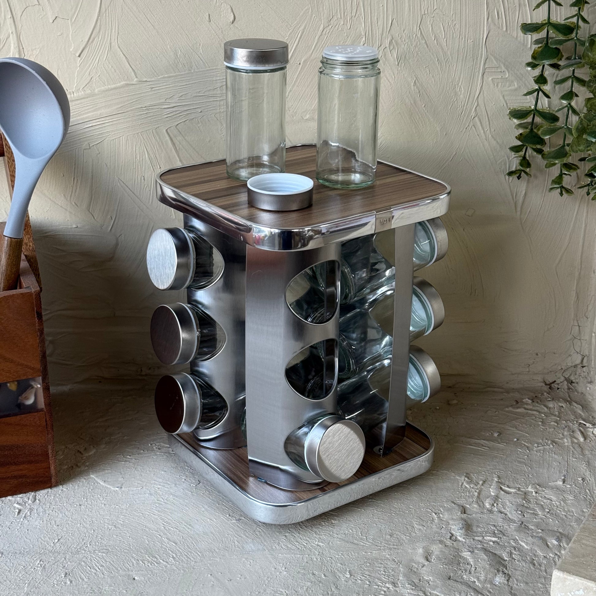 SVR Dönerli Standlı Kare Metal Kapaklı 12 Li Baharatlık Seti Ahşap-Gümüş KOD:710