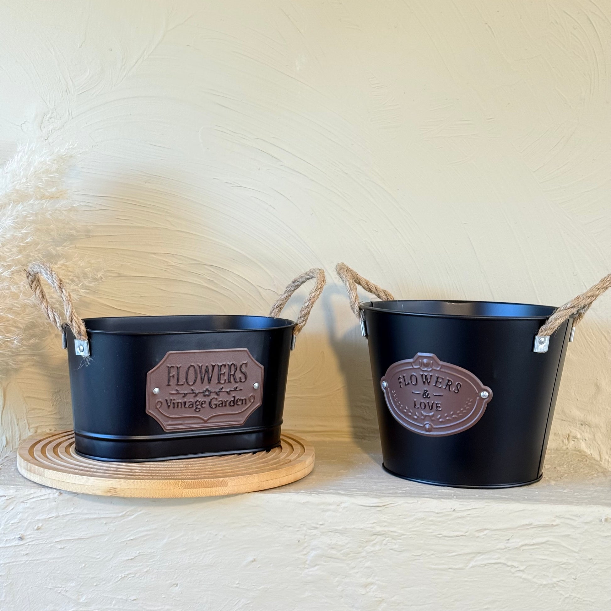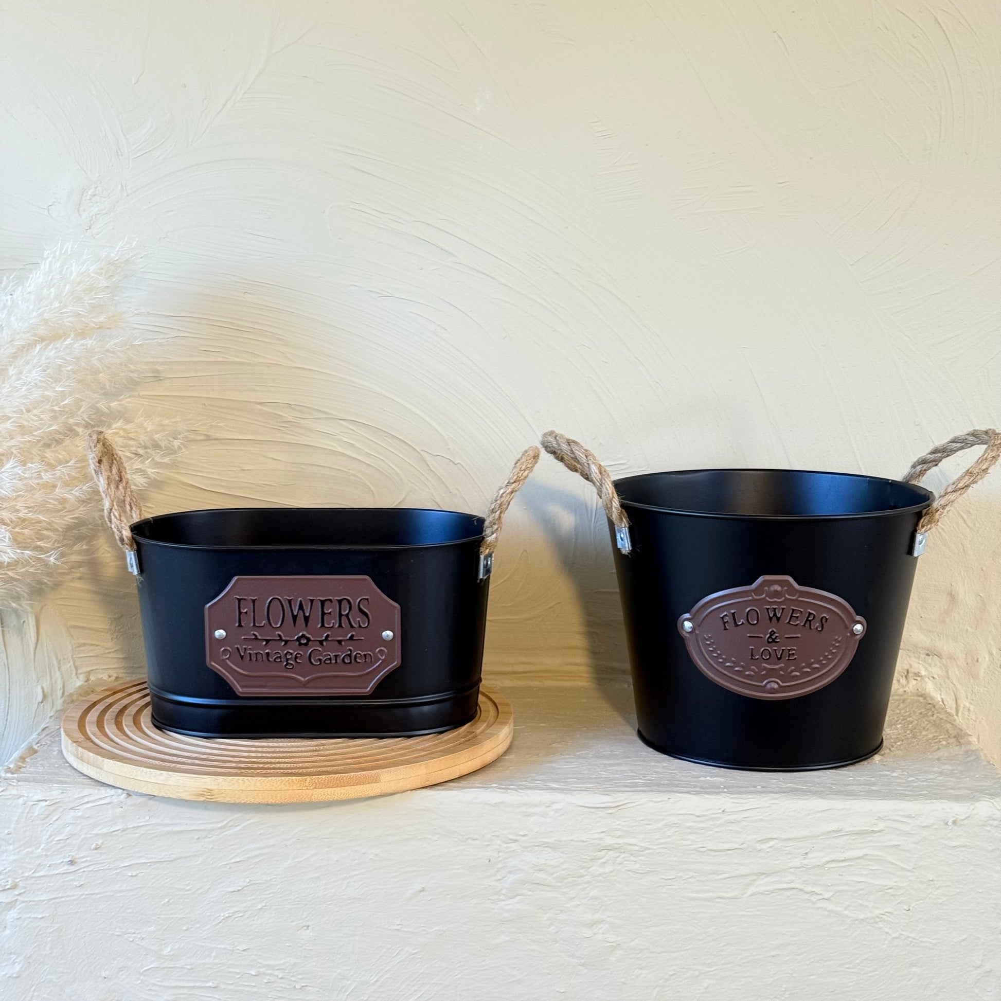 Tutku Halat Kulplu Metal İki Boy Vintage Saksı Siyah KOD:3455-54