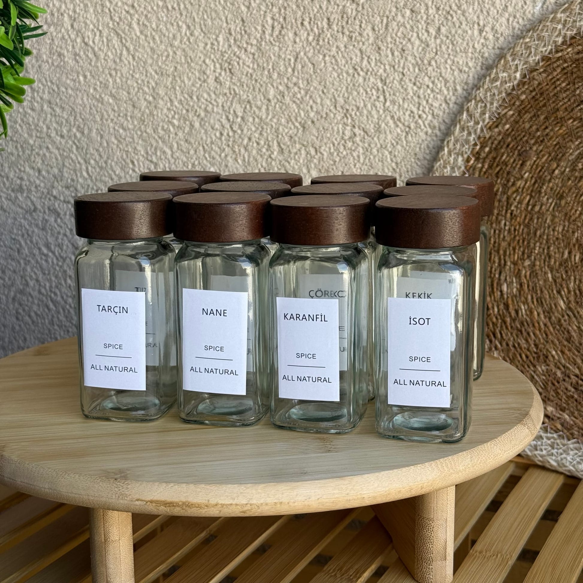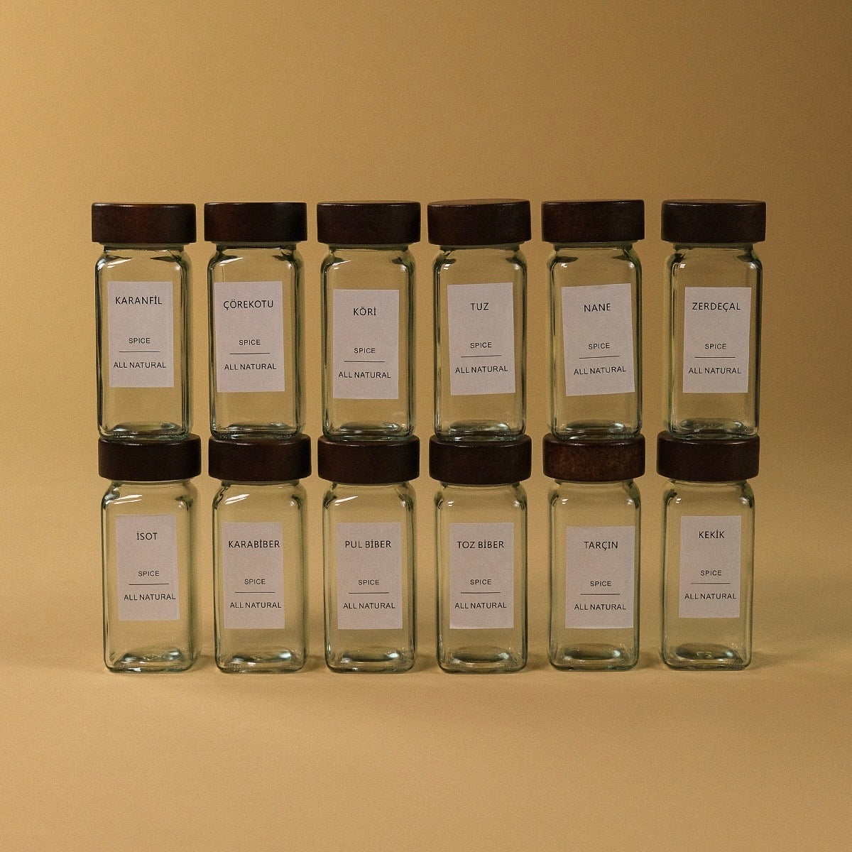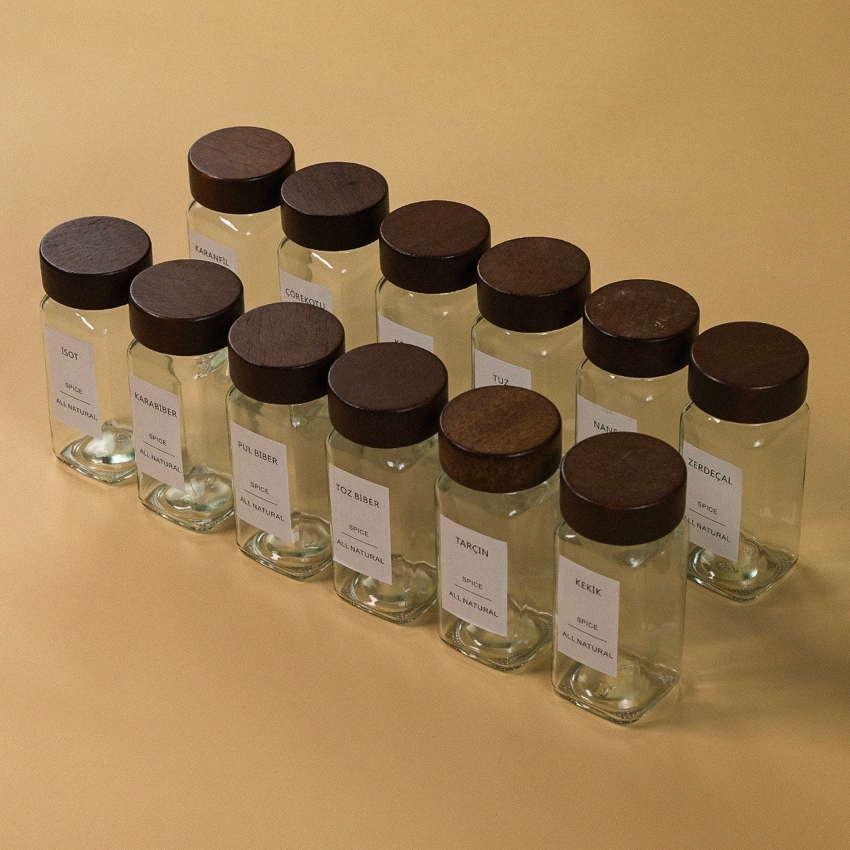 Utku Kare Akasya Kapaklı Baharatlık Seti 12 Adet Cam 120 ml